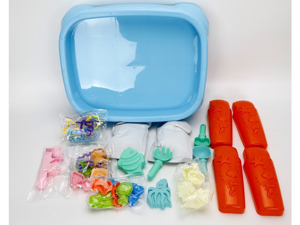 Součástí balení je bohaté příslušenství – barevné formičky ve tvaru zvířátek, lopatky, hrabičky i stoleček pro stavění. Díky různým barvám písku mohou děti vytvářet ještě zábavnější a barevnější výtvory. Sada je vhodná na doma i na zahradu, protože písek se nerozsypává a snadno se uklízí.