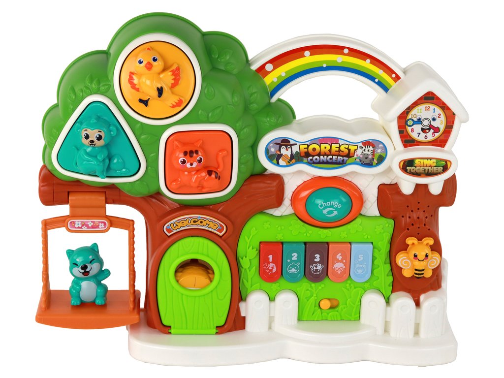Piano má tvar roztomilého lesa, což ihned přitahuje pozornost dítěte. Celá konstrukce je navržena tak, aby podněcovala batolata k objevování různých prvků. Dřevěný stromek má funkci nejen dekorativní, ale také poskytuje interaktivní prostředí. Na jeho větvích je zavěšena houpačka, na které se může houpat roztomilý ptáček nebo medvěd, kteří jsou součástí sady.