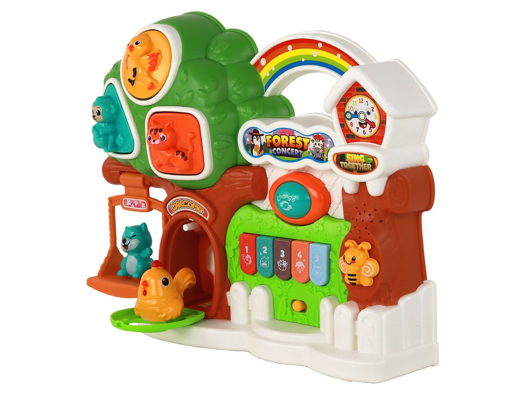 Na koruně stromu se nachází panel pro výuku, který probouzí smysly dětí. Když dítě stiskne tlačítka s motivy kočky, ptáka nebo opičky, každý z nich vydá charakteristické zvuky. Tato interaktivní část přispívá k rozvoji sluchových schopností a koordinačních dovedností.