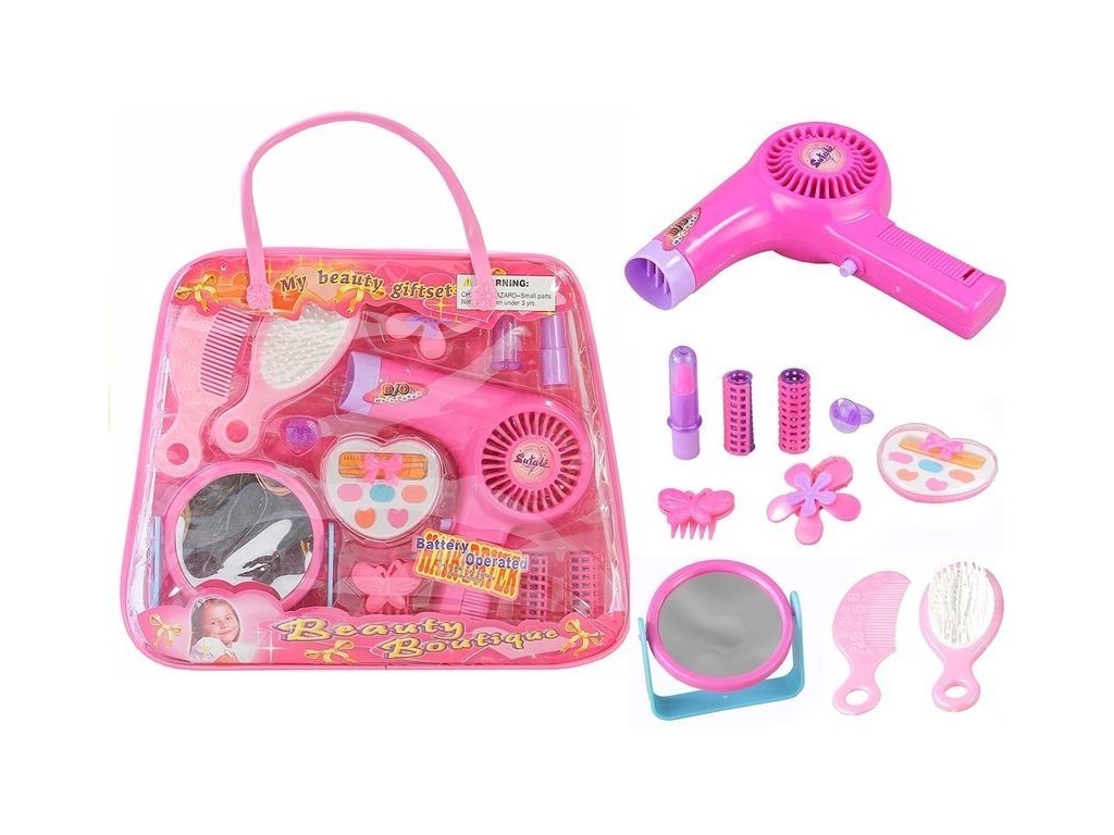 Fén na vlasy je napájen 1 baterií typu AA 1,5 V, která není součástí balení. Po vložení baterie a stisknutí tlačítka hračka vysouší vlasy velmi lehkým proudem vzduchu a přitom vydává charakteristický zvuk. Set je vyroben z pevného, odolného plastu. Konstrukce hraček je bez špičatých a nebezpečných konců, přesto dokonale napodobuje vzhled opravdových předmětů.