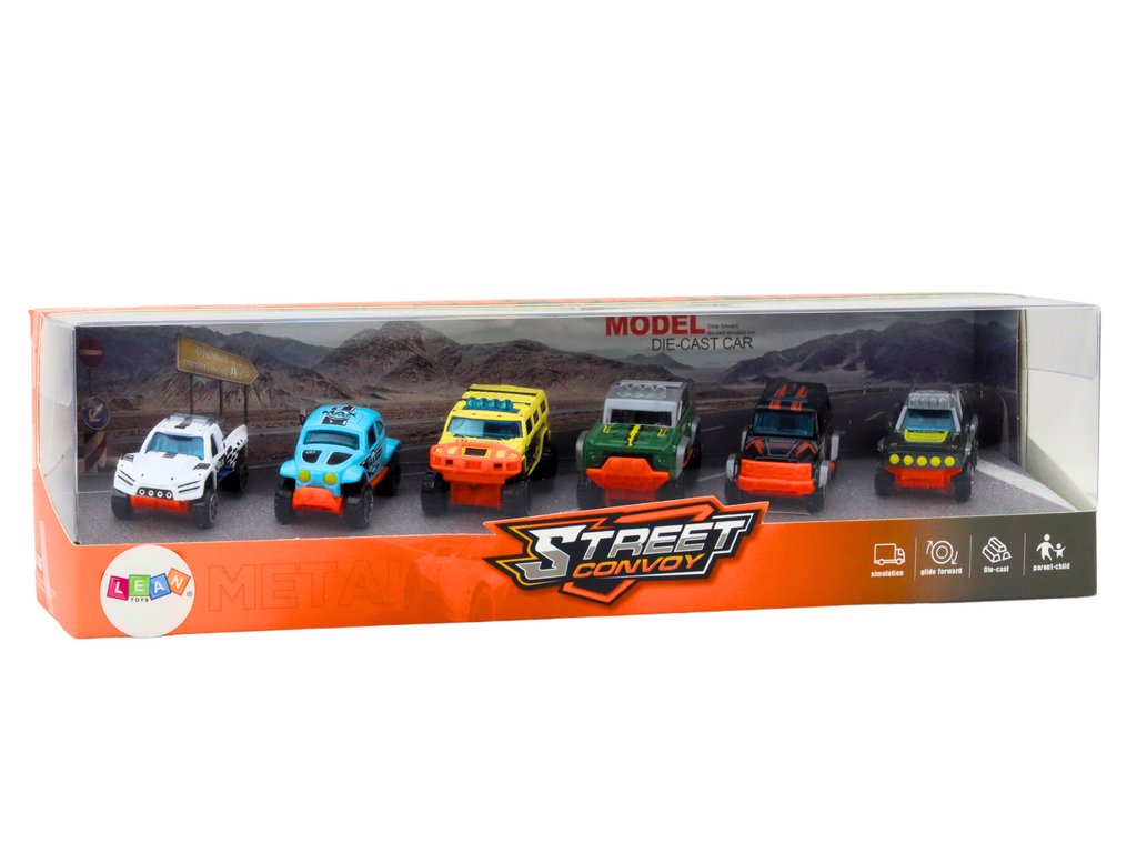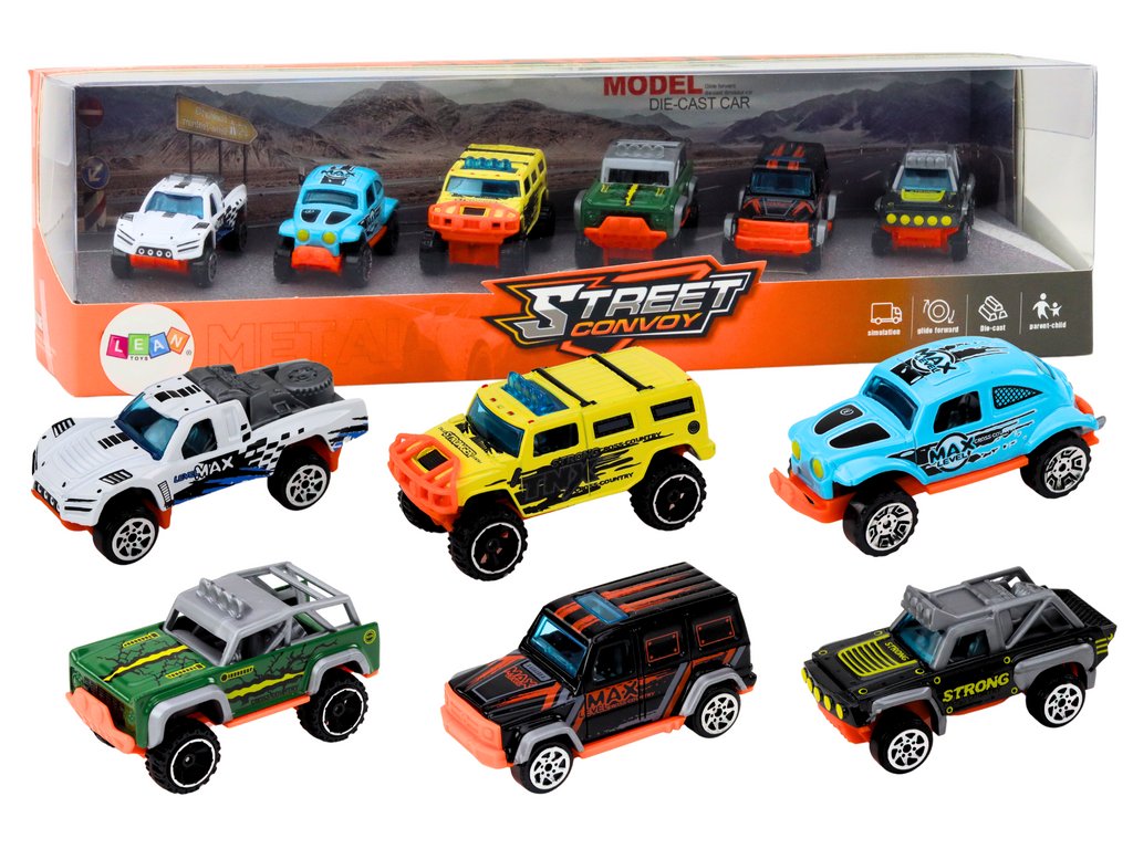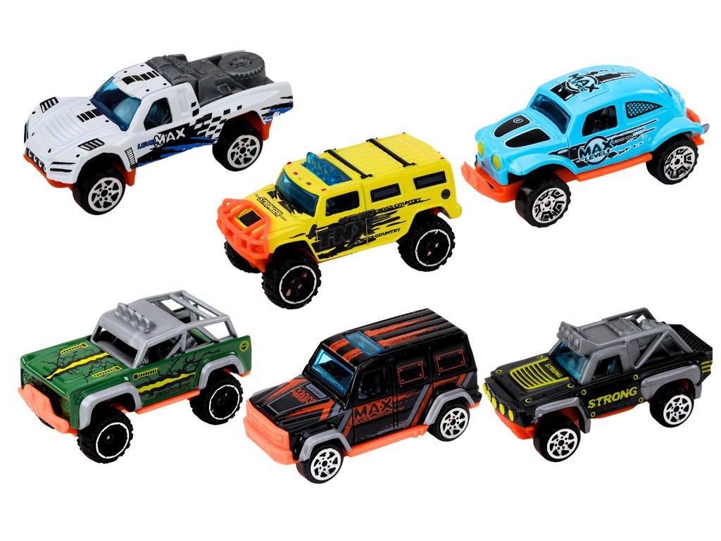 Naše sada obsahuje 6 různých modelů terénních autíček. Každé autíčko je pečlivě vyrobeno z kovu, což zaručuje nejen pevnost, ale také autentický vzhled a detaily, které přitahují pozornost.