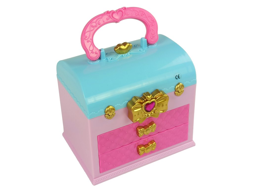 Celá sada je uložena v krásném kufříku uzavřeném sponou s mašlí a diamantovým srdíčkem. Samotný kufřík je velmi elegantně a zajímavě proveden. Růžové a světle modré barevné provedení se hodí do každého interiéru, zejména do dětského pokoje. Zásuvky jsou výsuvné a mají úchytku ve tvaru zlaté mašle. Po otevření pouzdra bude holčička nadšená z výběru barev očních stínů a lesku na rty. Na víku je zrcátko, takže si kazetu bude moci snadno vzít s sebou a kdekoli se namalovat.
