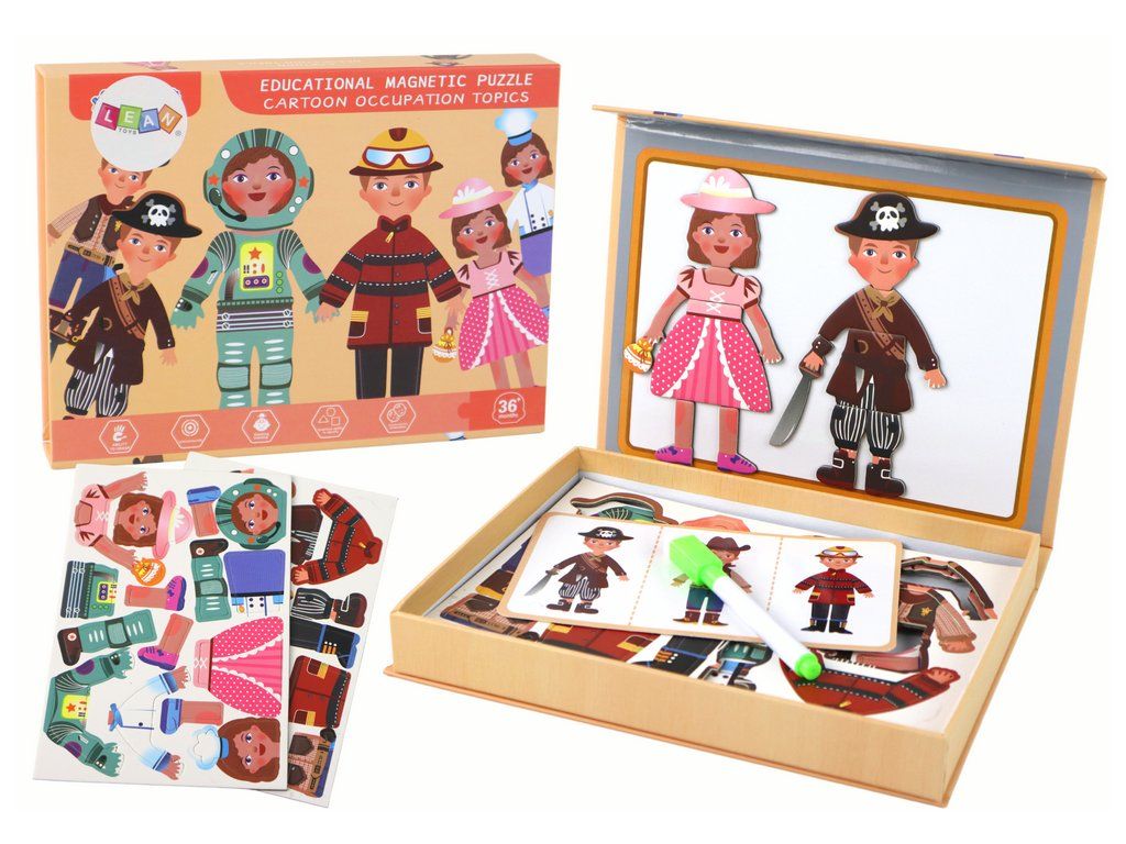 V sadě naleznete puzzle s motivy různých animovaných postaviček jako pirát, kosmonaut, kovboj a mnoho dalších, což otevírá dveře k nekonečným možnostem vyprávění příběhů. Děti mohou kombinovat různé postavy, vytvářet dialogy a inspirovat se magickým světem kreslených filmů.