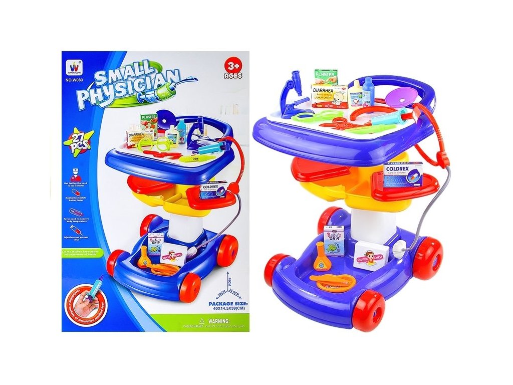Hraní si na lékaře je skvělý způsob, jak se vaše dítě naučí pomáhat druhým a je to také dobrý způsob, jak se zbavit strachu z lékaře. Jednotlivé lékařské přístroje jsou napodobeniny skutečných zdravotnických prostředků, které dostaly přátelské tvary a živé barvy. Velmi pestrá a efektivní sada bude fungovat v mnoha domácích zdravotnických centrech. Všechny nástroje lze umístit na vozík, který lze snadno přemístit k pacientovi. Sada je ideální dárek pro malé zdravotníky.