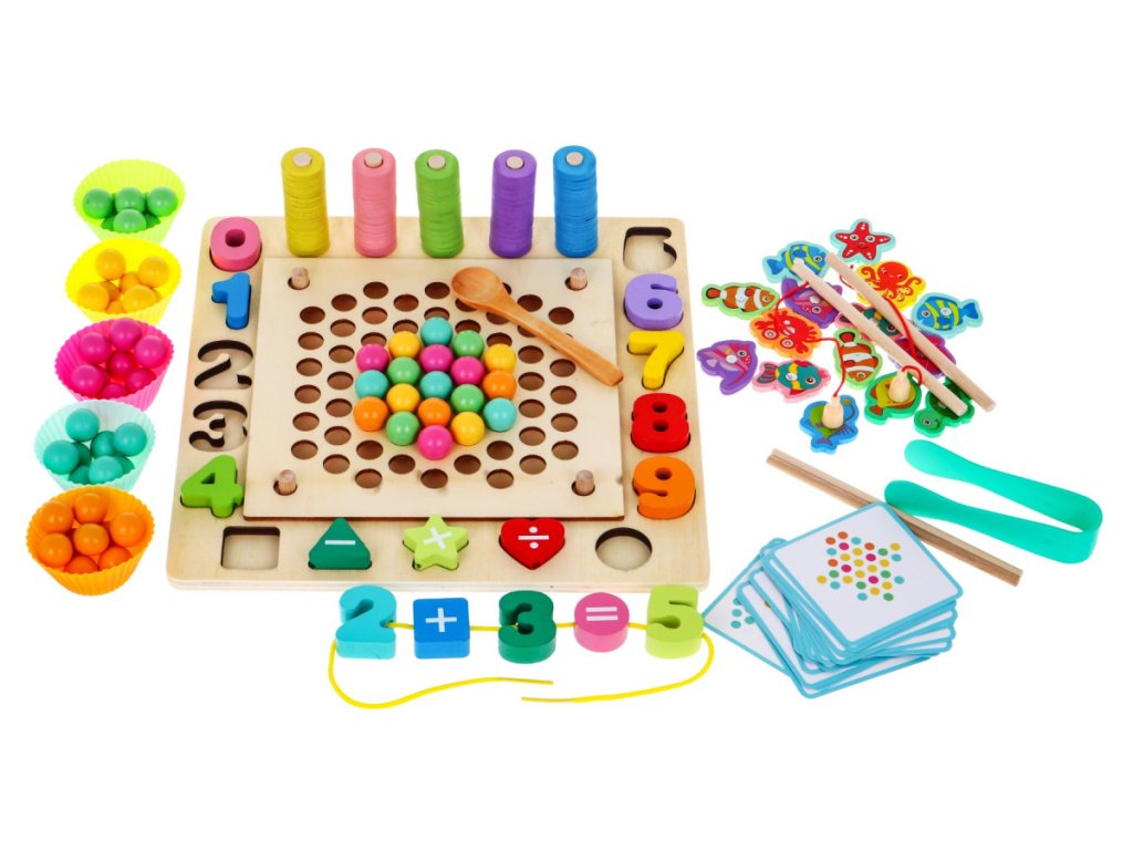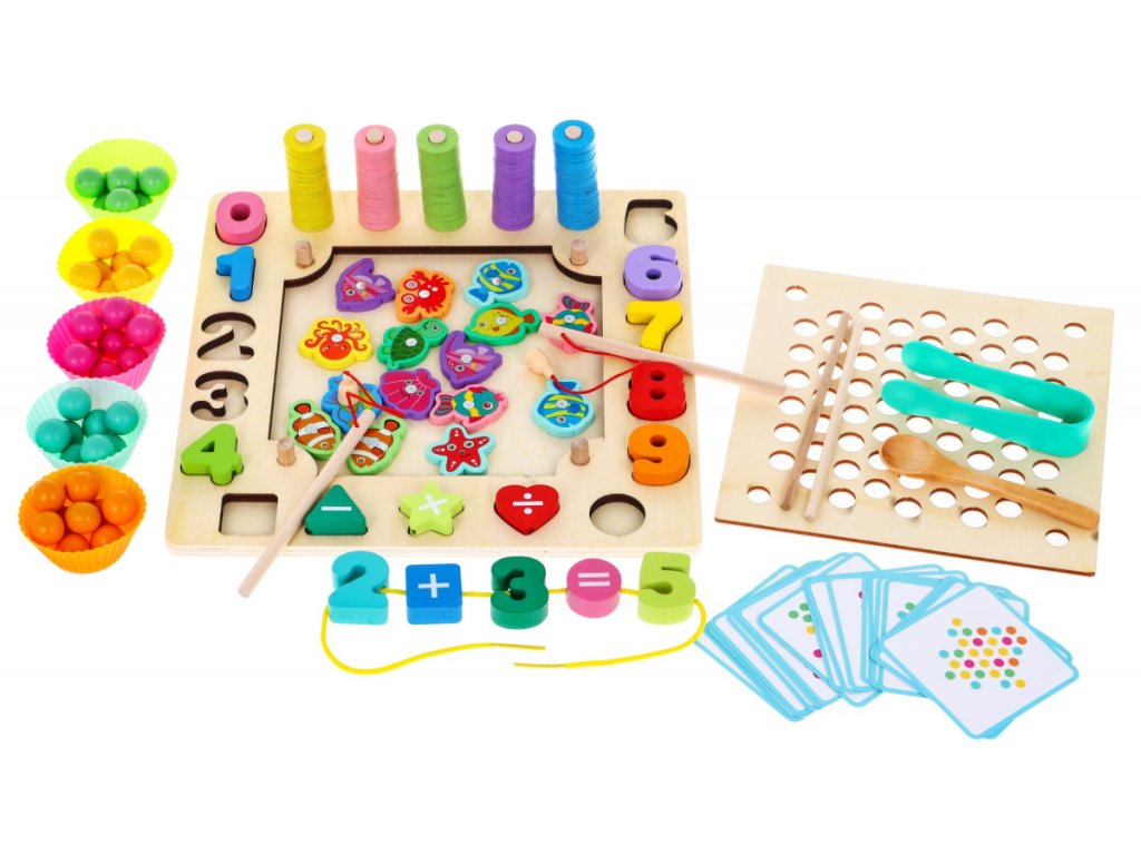 Hra uspořádání korálků podle vzoru z karet spočívá v tom, že dítě si vytáhne jednu z 18 karet, a poté uložit korálky podle vzoru. Hra pomáhá dětem procvičovat zrakové vnímání, hrubou motoriku, koordinaci očí a rukou, rozvíjet paměť a prostorovou orientaci.