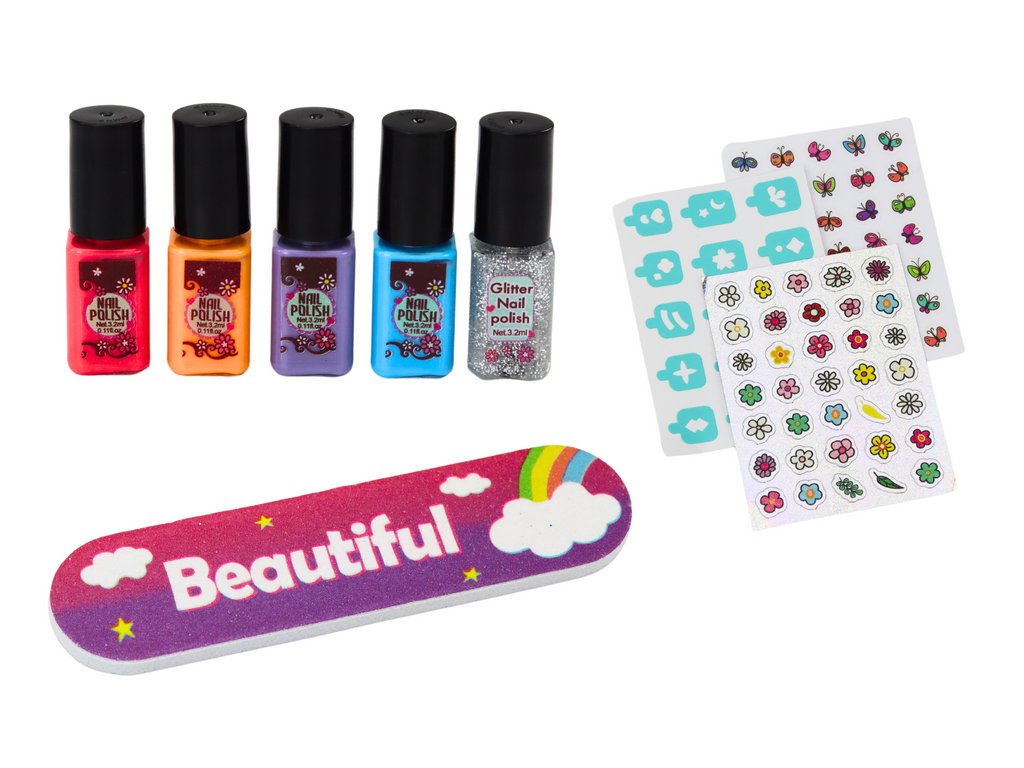 Barevný komplet laků v různých odstínech nabízí úžasnou paletu, která umožní vytvořit neopakovatelné manikúry, přizpůsobené každé příležitosti a náladě. Nálepky, které jsou součástí sady, přidávají ještě větší možnosti tvorby fantastických vzorů a ozdob, takže manikúra se stává skutečným uměleckým dílem.