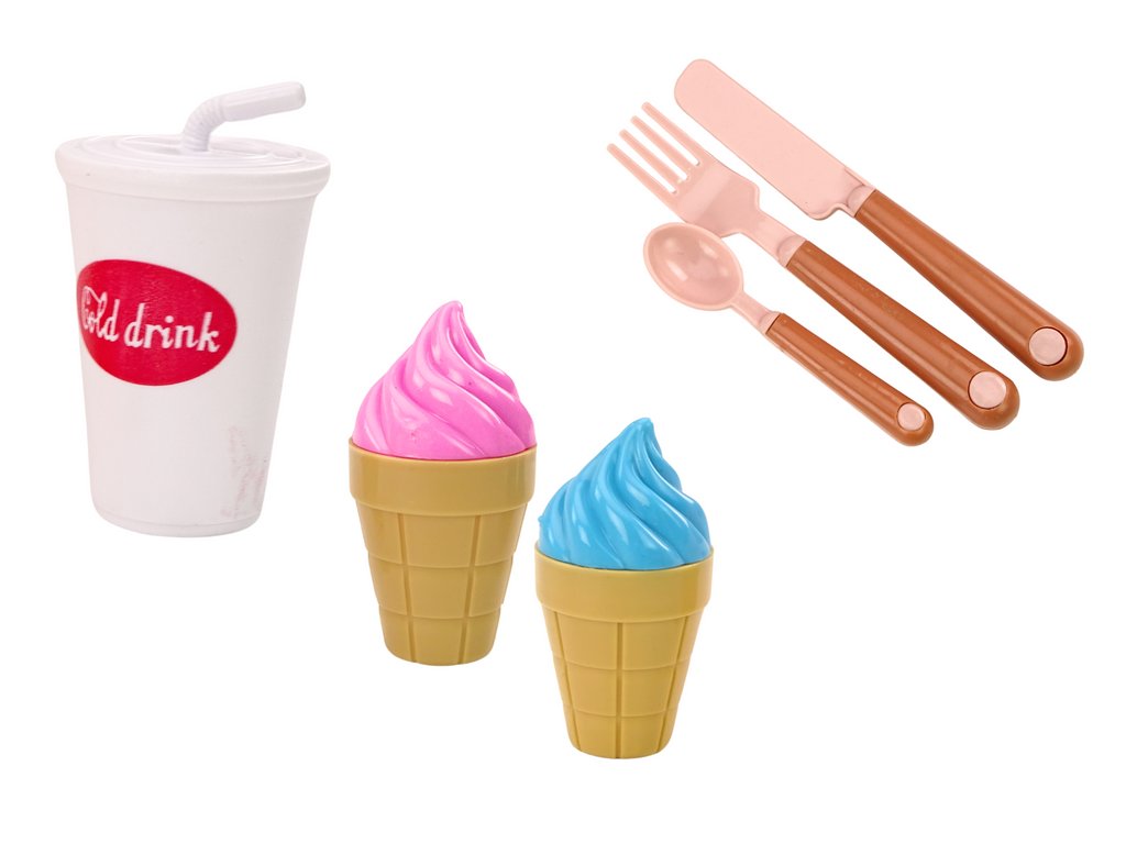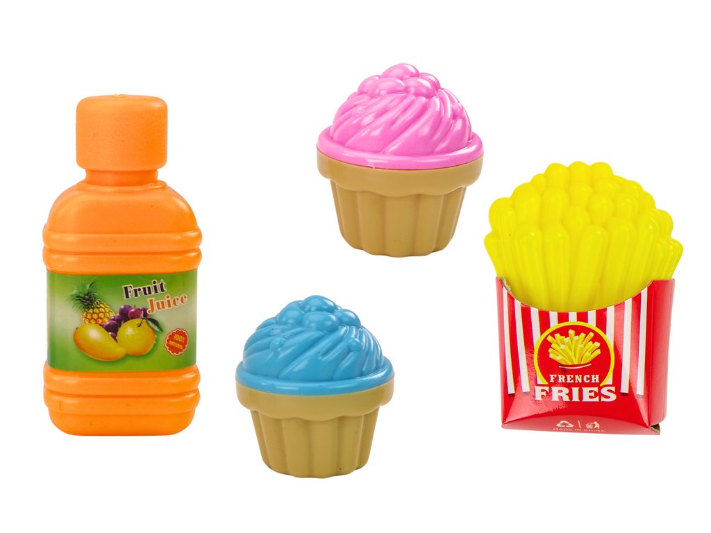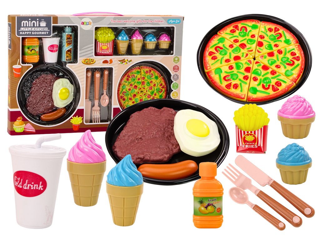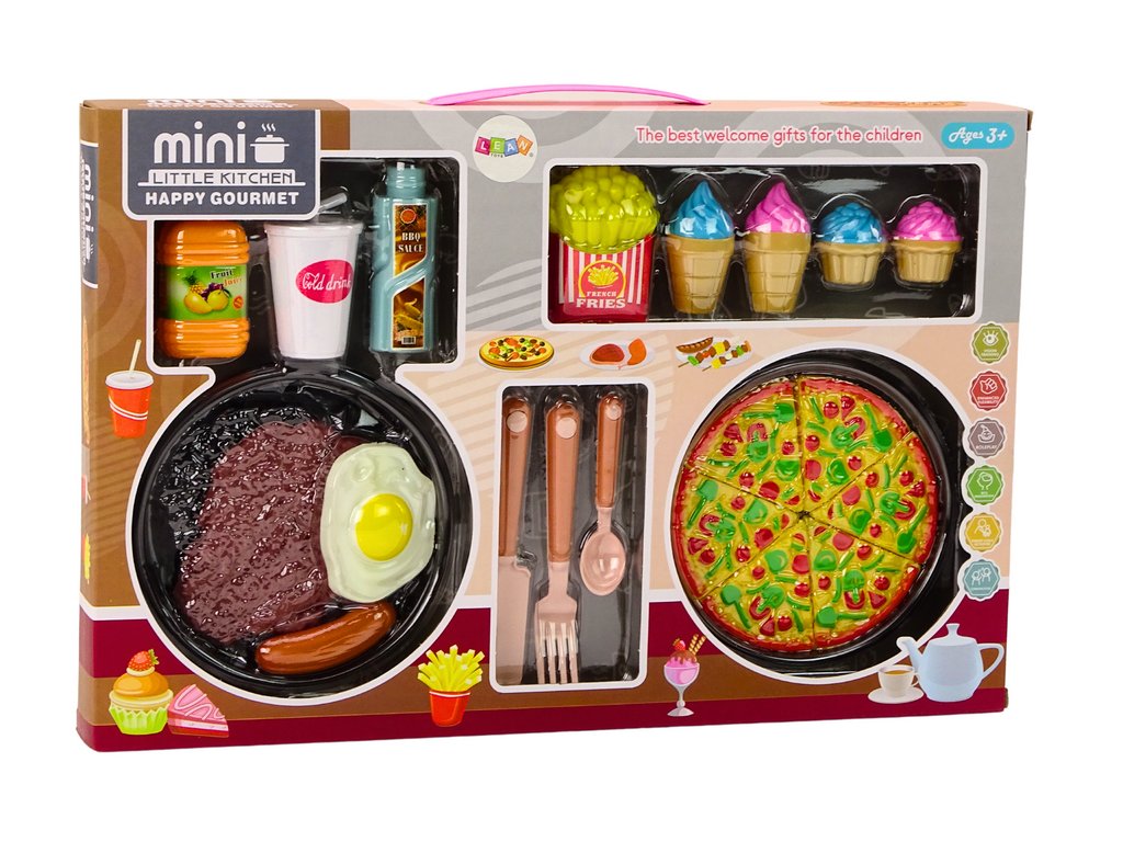 Tato sada potravin je hračka, která dětem umožňuje objevovat svět kulinářství prostřednictvím hry. Skládá se z různých, realisticky vypadajících prvků a je ideální pro malé kuchaře, kteří rádi tvoří a servírují chutné pokrmy. Sada obsahuje širokou škálu potravin, včetně pizzy rozdělené na kousky, sázeného vejce, řízku, párku, BBQ omáčky, nápoje se slámkou, džusu, hranolků, dvou zmrzlin a dvou muffinů. Každý díl je pečlivě vyrobený z bezpečných materiálů, aby zajišťoval dlouhodobou zábavu.