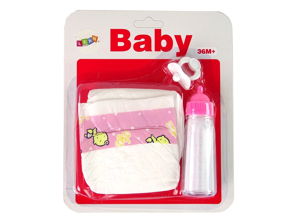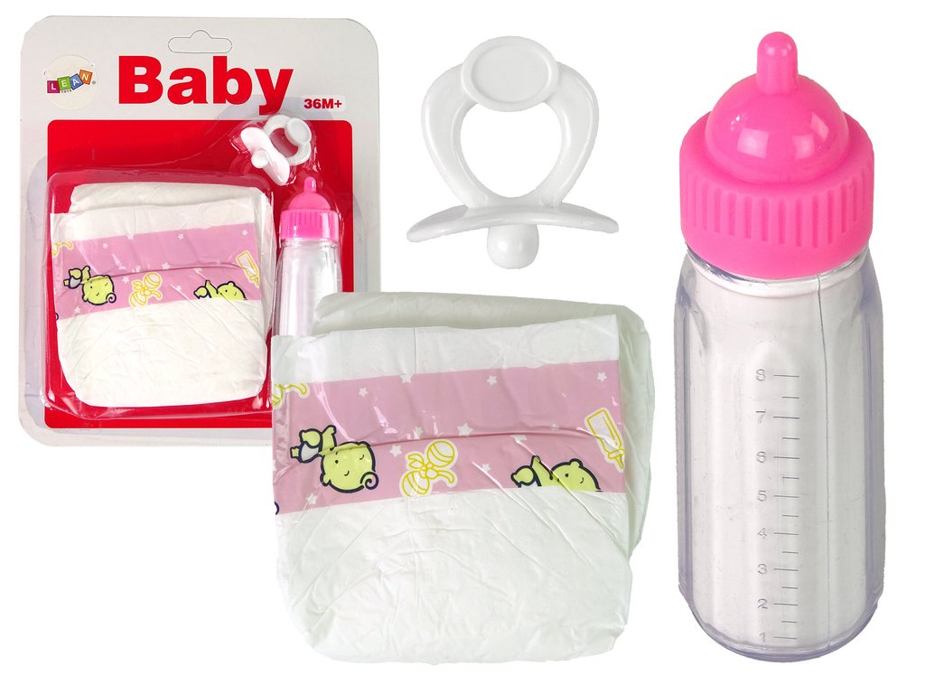 Sada příslušenství pro panenky je nesmírně roztomilý doplněk, který malé dívky přenese do světa hraní si na domácnost a rodinnou péči. V sadě se nachází průhledná láhev s bílým vnějškem napodobujícím mléko, bílý dudlík a roztomilá bílá plenka s růžovými motivy.