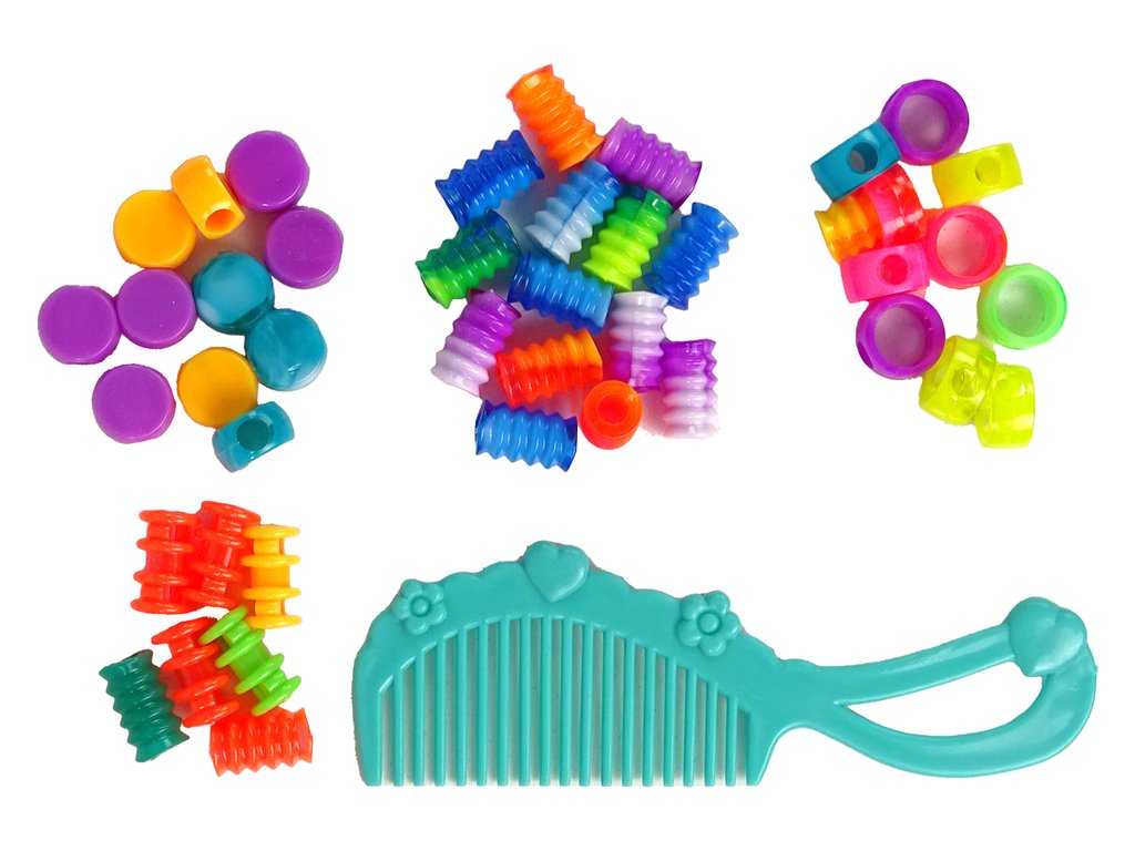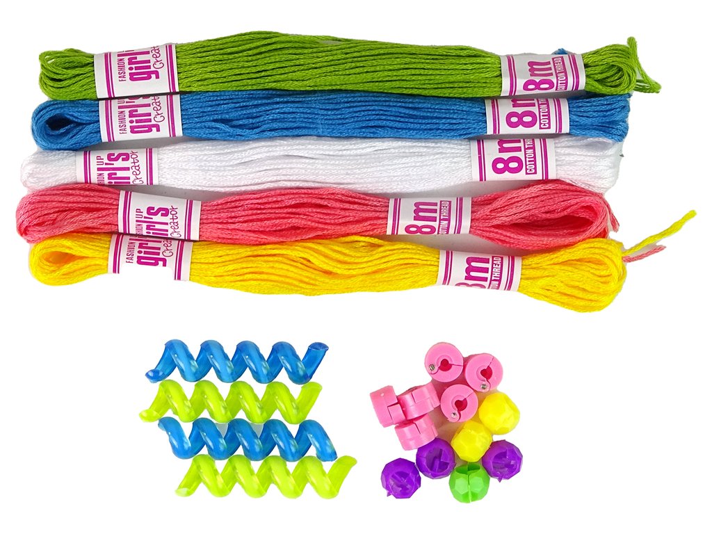 Sada obsahuje mnoho korálků v odstínech růžové, žluté, fialové, zelené, modré a oranžové, otevírá před Vámi nekonečné možnosti tvorby. Pět osmimetrových bavlněných nití v zelené, modré, bílé, růžové a žluté barvě umožní vytvořit různé styly. K tomu je přiložen modrý hřeben pro pohodlí.