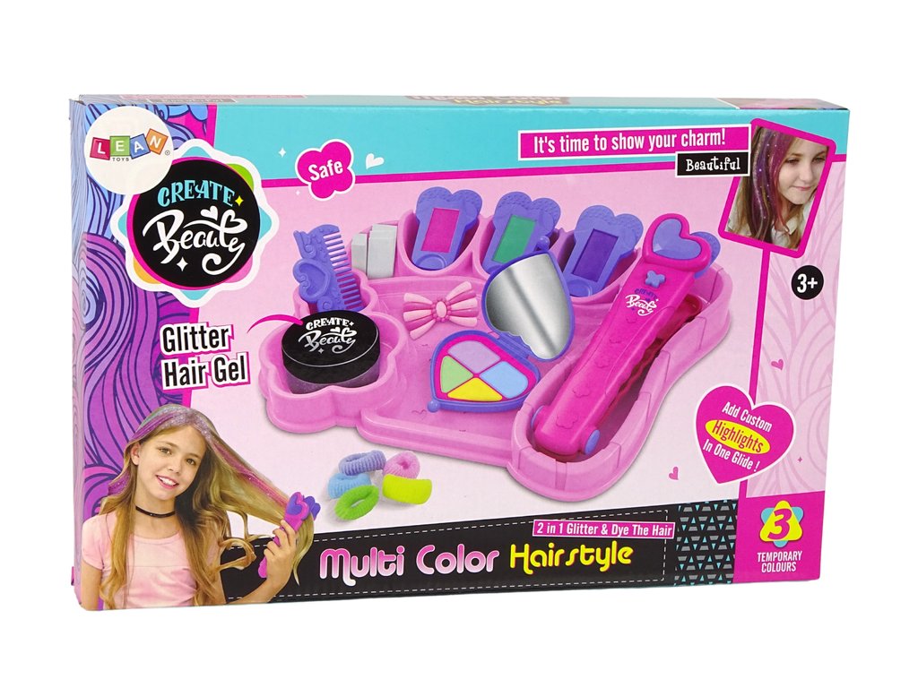 Skvělý soubor stylizačních nástrojů na vlasy pro malou slečnu. Najdeme zde žehličku pro výrobu barevných pasem na vlasech s vyměnitelnými vložkami. Sada je ideální pro dívky, které se rády hrávají na holičský salón.