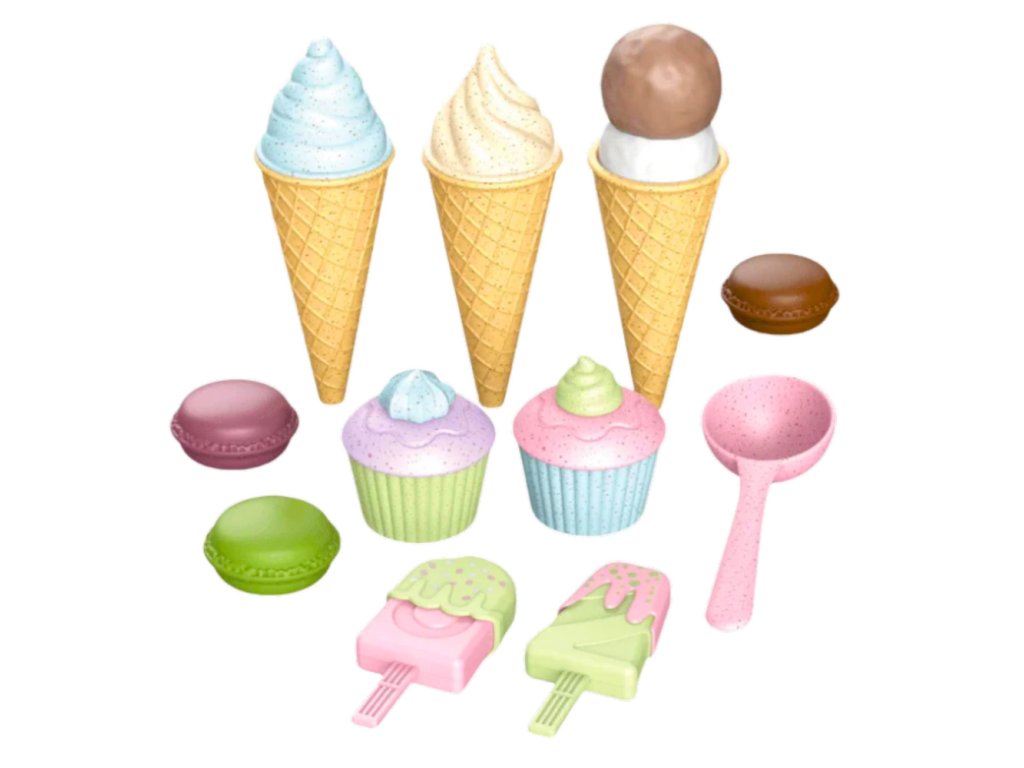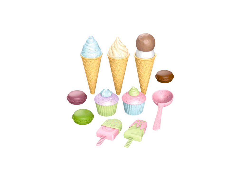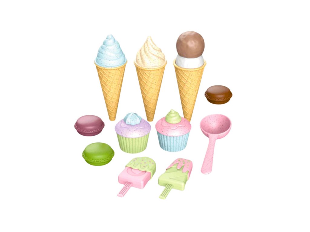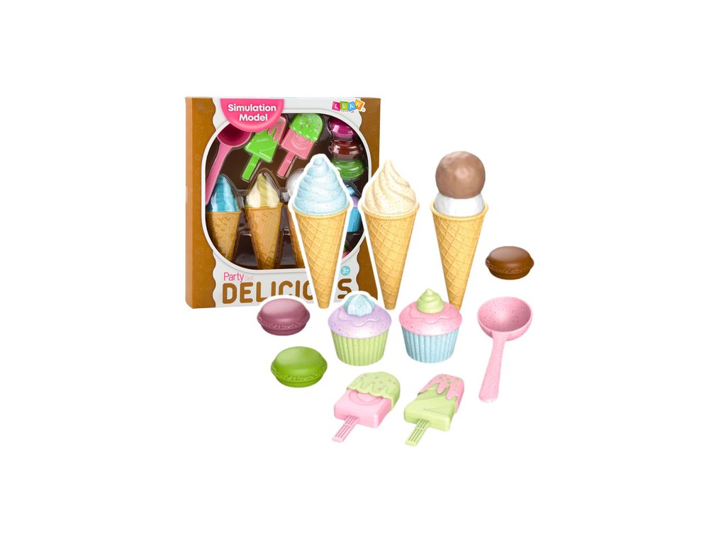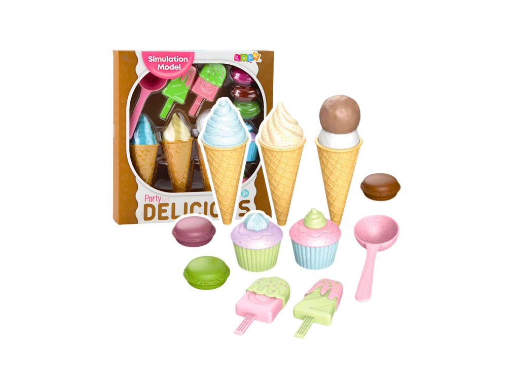 Tato barevná sada zmrzliny a sladkostí je ideální hračkou, která děti zavede do světa lahodných dezertů a kreativního hraní rolí. Sada obsahuje řadu prvků - kornoutky na zmrzlinu, zmrzlinu na špejli, košíčky, makronky a lžičku na nanášení. Vše bylo vyrobeno s důrazem na detail, aby se co nejvíce podobalo skutečným pochoutkám.