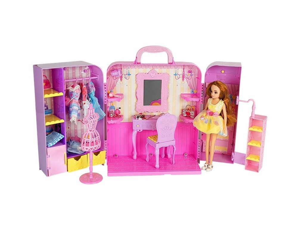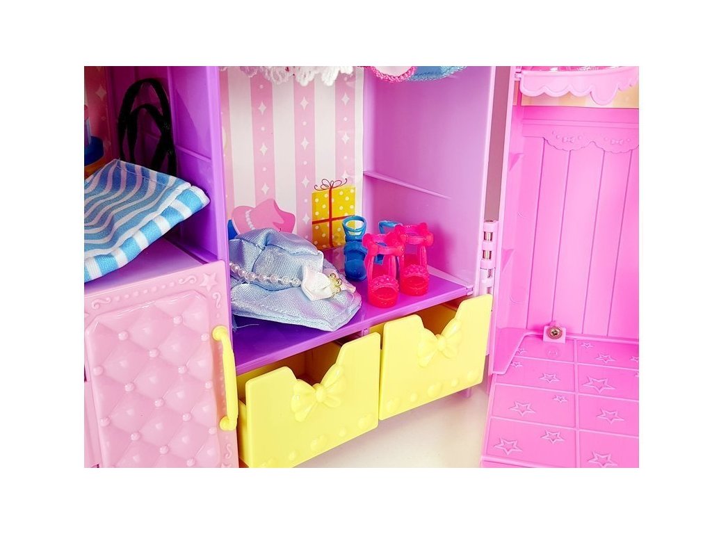 Velkou výhodou našeho šatníku je, že má světla, která osvětlují beauty koutek. Navíc můžete změnit úhel dopadu malých reflektorů. Mnoho lesklých doplňků a napodobenin pečující kosmetiky Vám umožní připravit panenku na hraní od začátku do konce s nejmenším detailem.