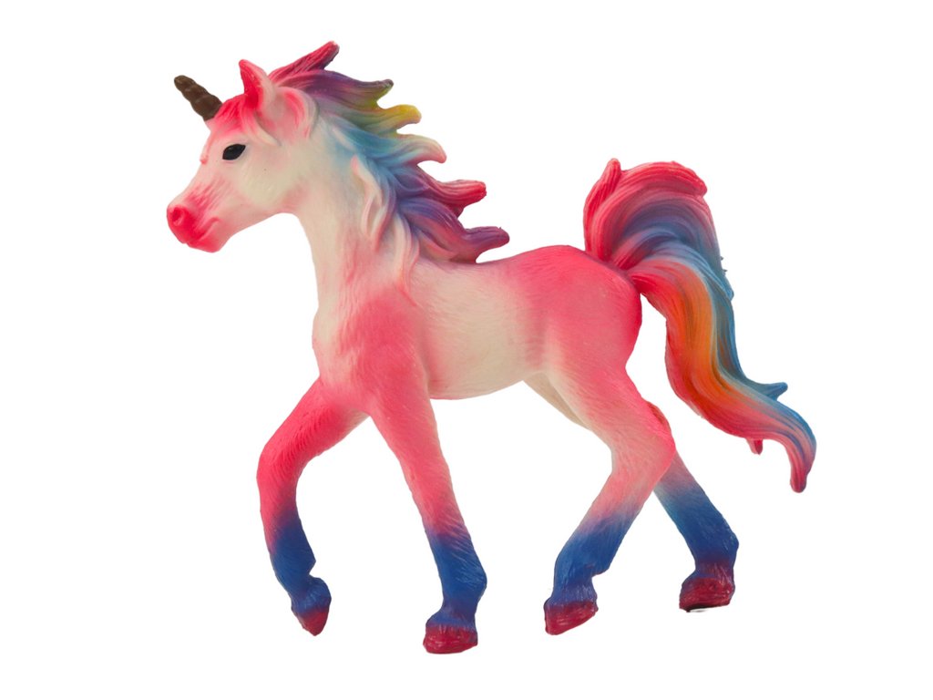 Hříva a ocas jednorožce jsou barevné, což mu přidává pohádkové kouzlo a činí figurku poutavou díky svým živým barvám. Barevné prvky nádherně kontrastují s růžovým tělem, což vytváří harmonický a estetický celek.