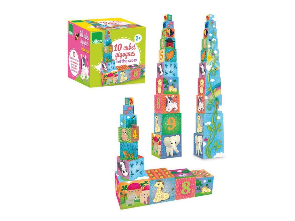 Deset kartonových skládácích kostek s pěknými ilustracemi. Děti se při hraní si naučí jak skládat kostky a také o zvířatech a jejich potravě, barvách... Rozvíjí koordinaci ruka-oko a zručnost dětí. Hračky Vilac mají značku francouzské agentury ADEME, to znamená, že tyto dřevěné hračky jsou vyráběny ekologicky. Šetří životní prostředí, neznečišťují půdu, vodu a vzduch, neplýtvají energiemi.