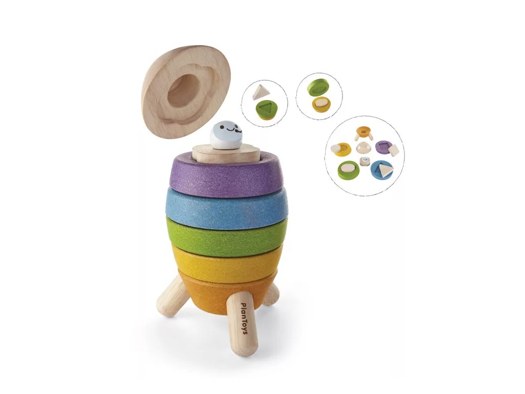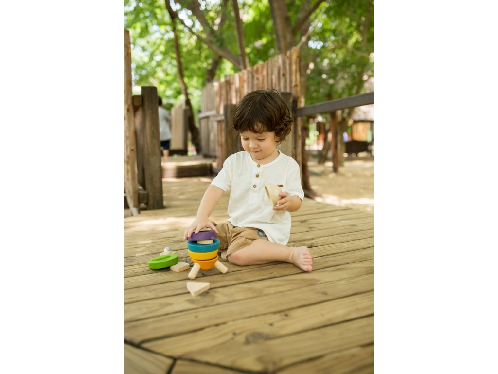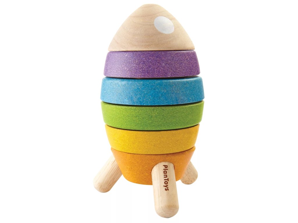 Skládací raketa od Plan Toys zabaví zvídavé děti a rozvíjí jejich dovednosti při hře. Děti skládají raketu z barevných dřevěných dílků, které do sebe přesně zapadají, a vytvářejí tak správné přechody mezi jednotlivými částmi.