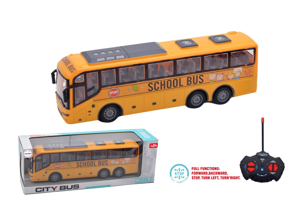Žlutý RC školní autobus v měřítku 1:24 potěší každého malého fanouška velkých vozidel. Realistický design s průhlednými okny a sedadly uvnitř působí jako skutečný autobus. Díky dálkovému ovladači je možné se školním autobusem jezdit vpřed, vzad, zastavit a zatáčet doleva i doprava.