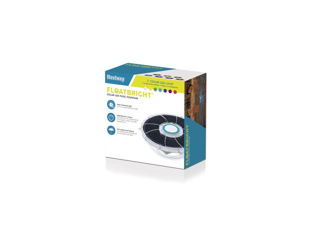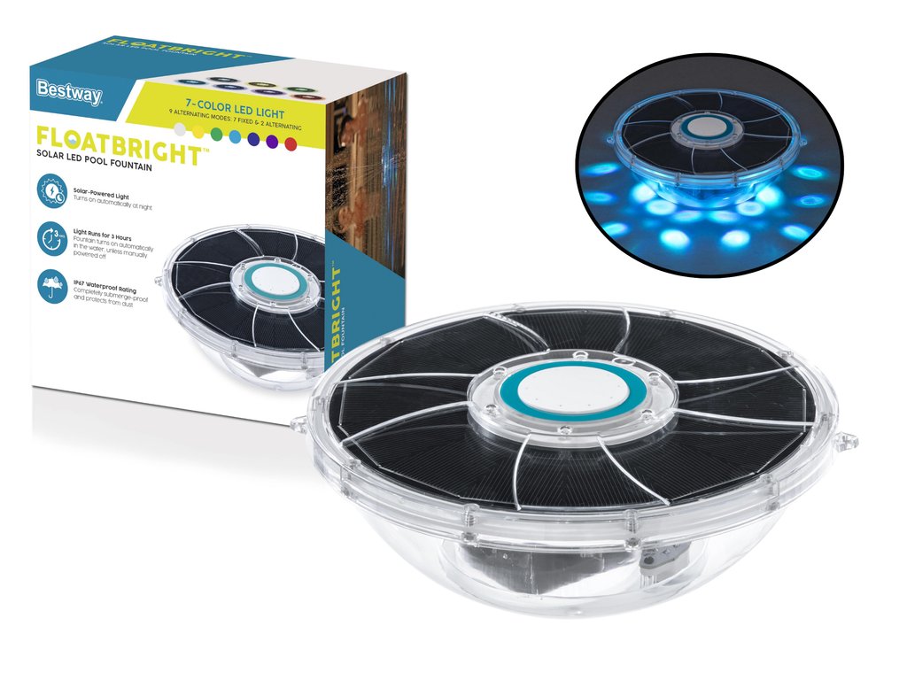 Fontána Bestway LED je moderní plovoucí doplněk, který kombinuje vodní efekt s barevným osvětlením. Je napájena solárním systémem, automaticky se spouští za soumraku a vypíná se po jedné hodině provozu. je ideální volbou pro ty, kteří chtějí dodat atmosféru svému večernímu koupání a zlepšit cirkulaci vody v bazénu. Vodotěsnost a intuitivní ovládání jedním tlačítkem z něj činí ideální volbu pro každého, kdo ocení pohodlí a výrazný design.