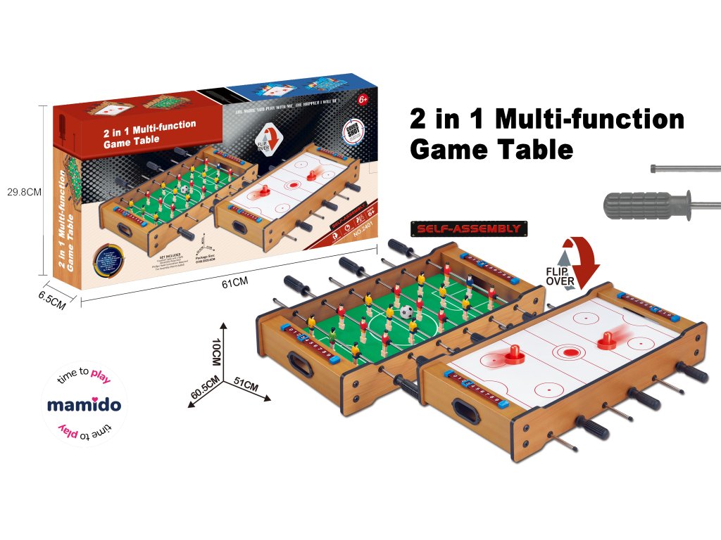 Dvojitá porce zábavy v jednom! Multifunkční herní stůl 2v1 přináší oblíbený stolní fotbálek a otočným převrácením se promění na hokejový stůl. Díky kompaktním rozměrům je ideální pro domácí hraní a snadno se vejde i do menšího pokoje.