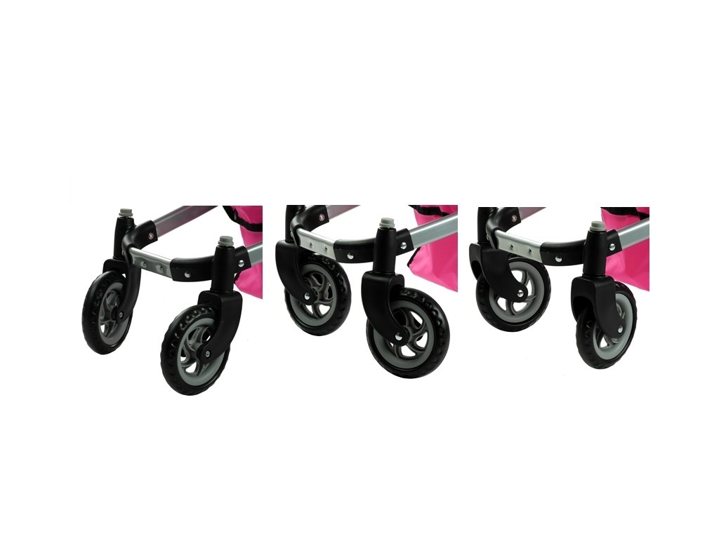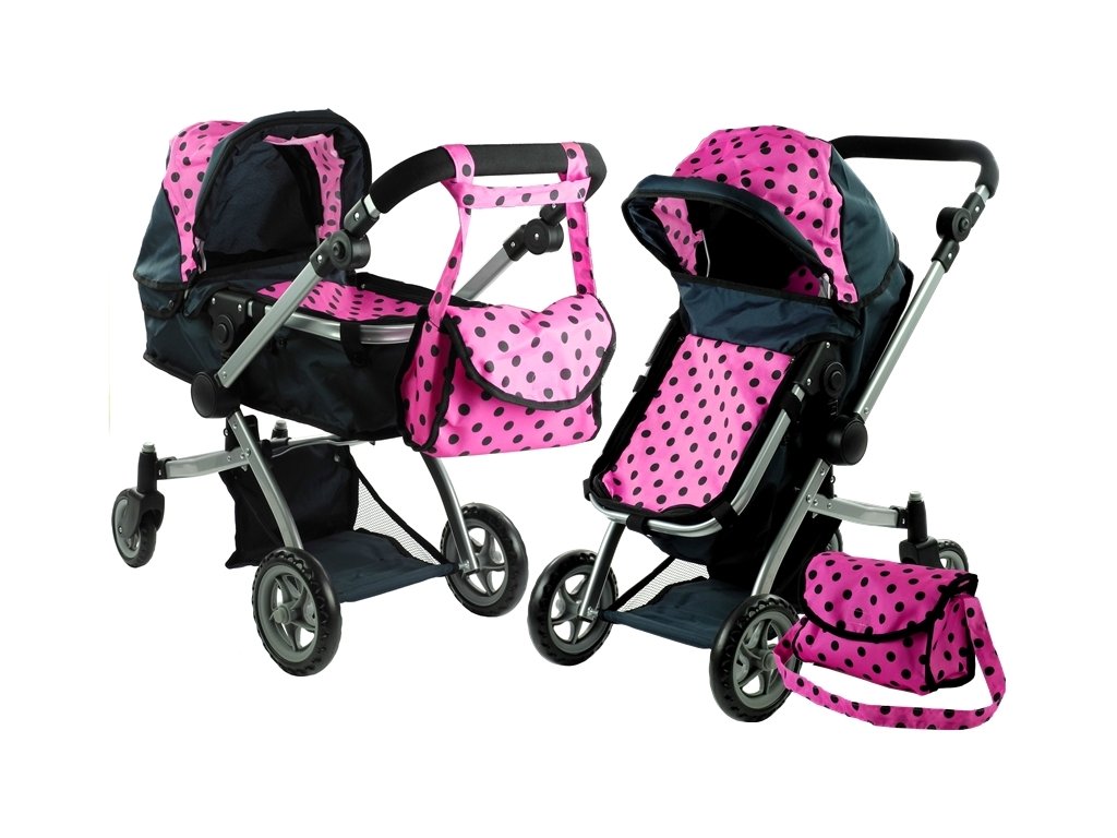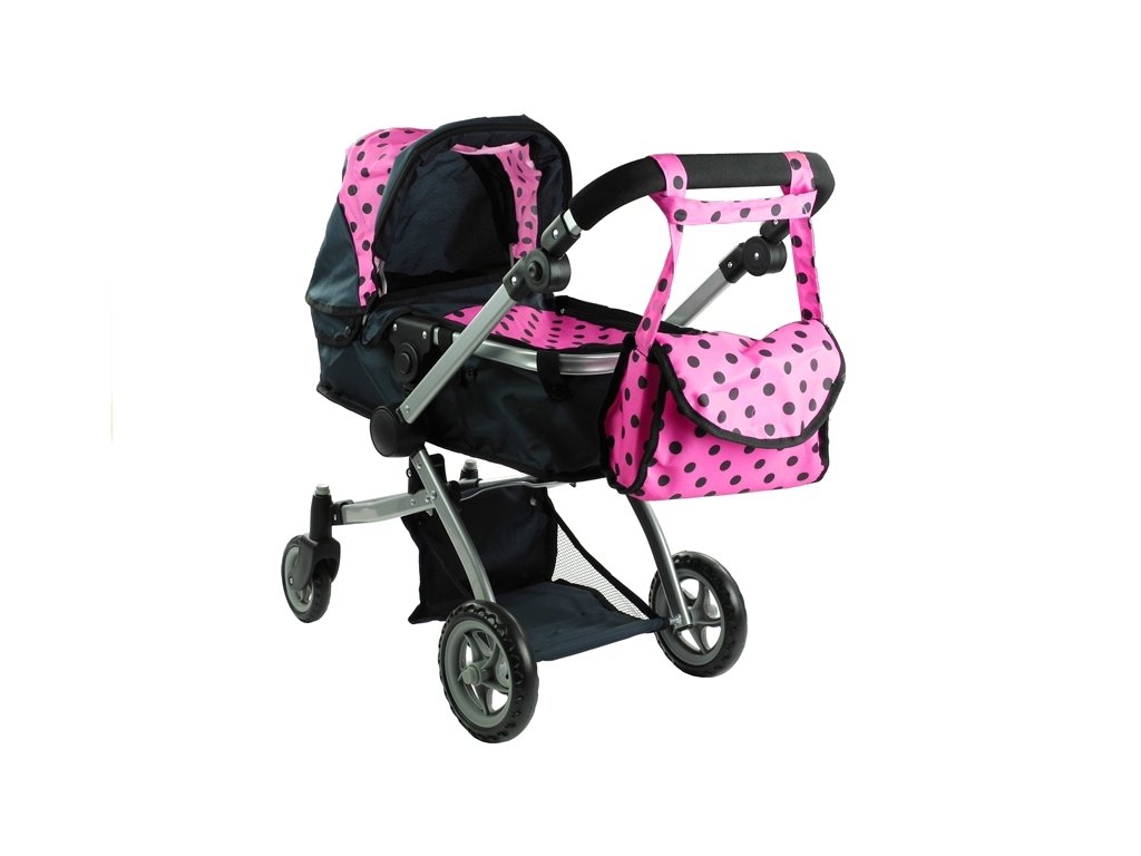 Kočárek pro panenky vhodný pro děti od 3 let. Model 2 v 1 má přední kola otočná o 360 stupňů, díky kolům z kombinace pěny a gumy umožňuje dětem hrát si doma bez obav z poškrábání podlahy. V sadě je obsažena brašna pro drobné předměty, ve které bude dívka schopna nosit různá příslušenství, díky čemuž se bude cítit jako skutečná maminka. Kočárek vyroben z certifikovaných materiálů nejvyšší kvality, což je zárukou spolehlivosti a dlouhé životnosti hračky. Vozík je označen certifikátem CE.
