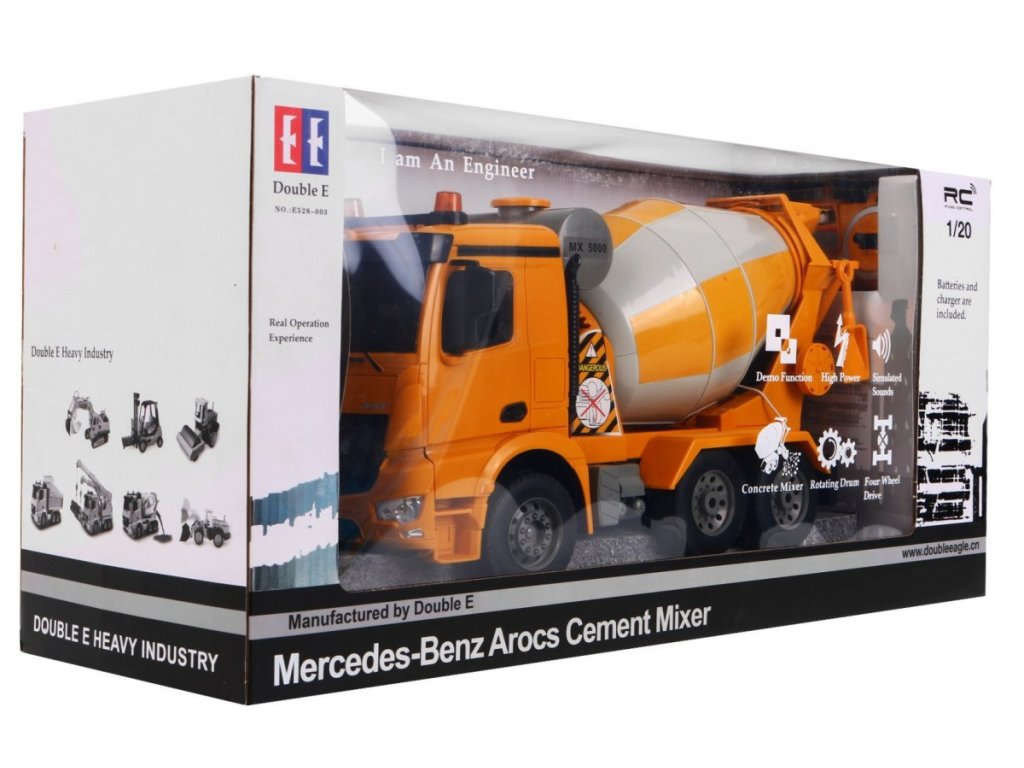 Stavební auto Mercedes je skvělá hračka pro děti, ale také některé dospělé, kteří mají rádi dobrodružství s dálkově řízenými vozy. Jízda je doplněna světelnými efekty (zabudované extrémně jasné LED diody). Kvalitní gumová kola, která imitují pneumatiky. Pohodlné držení dálkového ovladače zajišťuje řízení všemi směry. Ve spodní části stavebního vozidla se nachází spínač pro zapnutí/vypnutí. Domíchávač je vyroben z vysoce kvalitního plastu a výborných elektronických komponentů. Hračka je určena pro děti od 6 let a má certifikát CE.