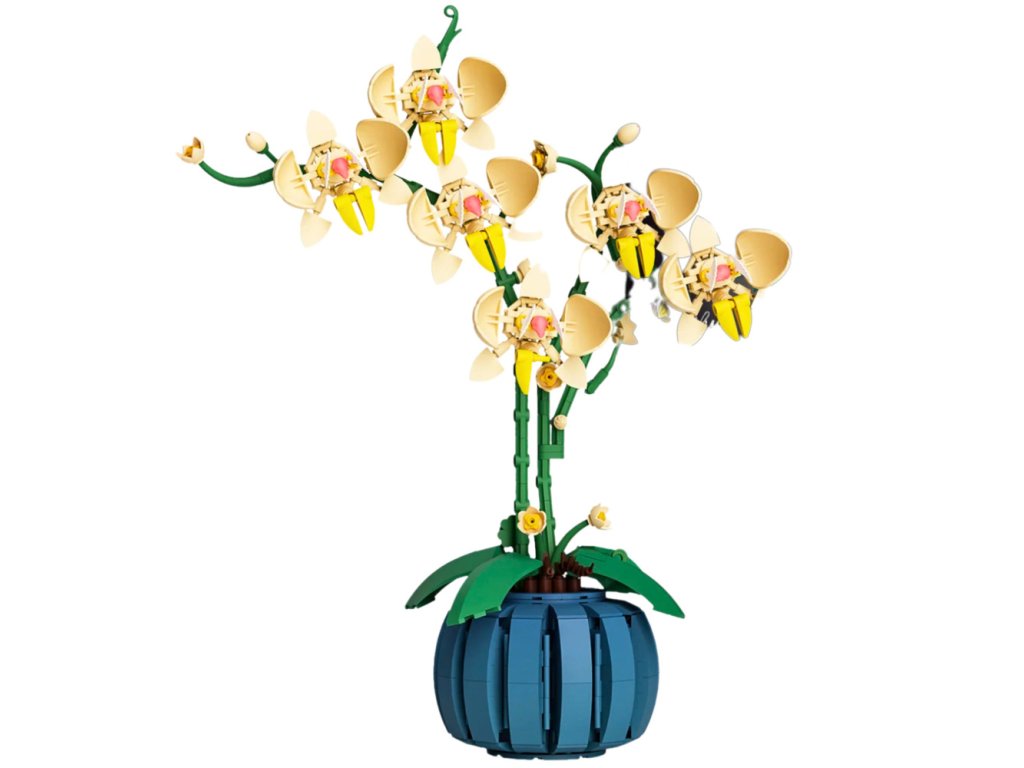 Dopřejte si kreativní zábavu i elegantní dekoraci v jednom. Tato stavebnice vám umožní postavit nádhernou orchidej v jemných tónech béžové, žluté a růžové, doplněnou o stylizovaný tmavě modrý květináč. Díky realistickému zpracování a decentní barevnosti působí hotový model velmi elegantně a stane se originální ozdobou poličky, stolu nebo komody.