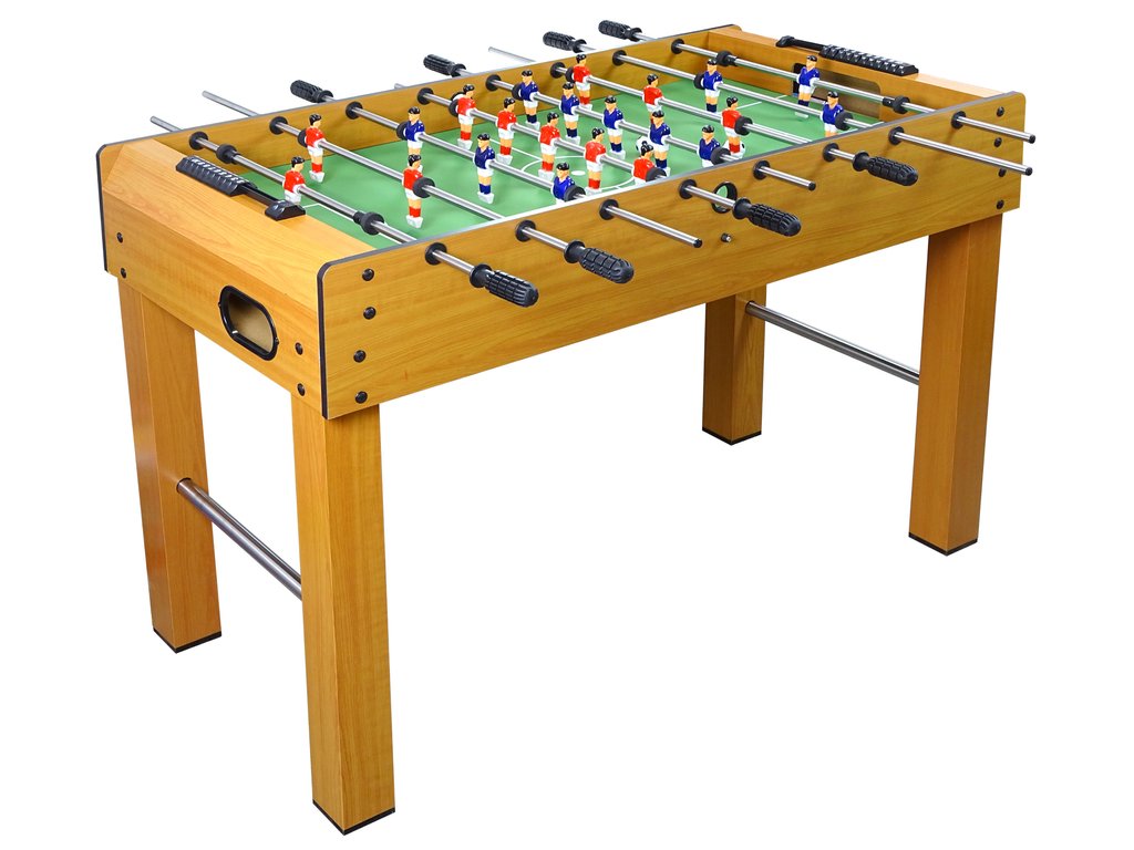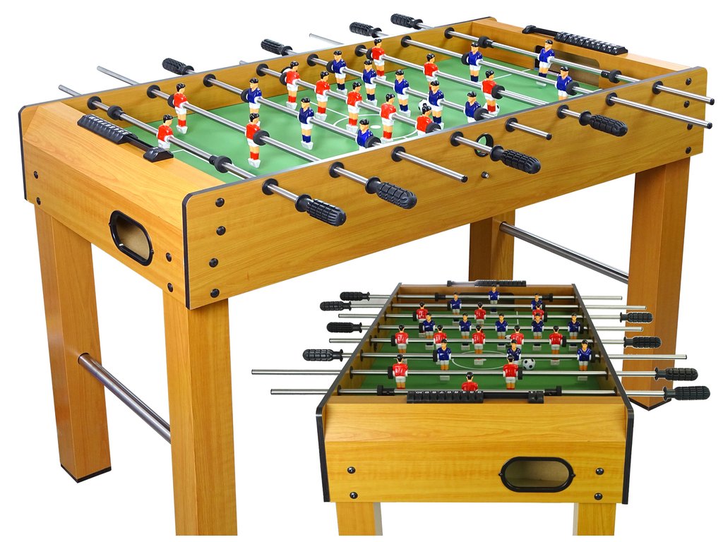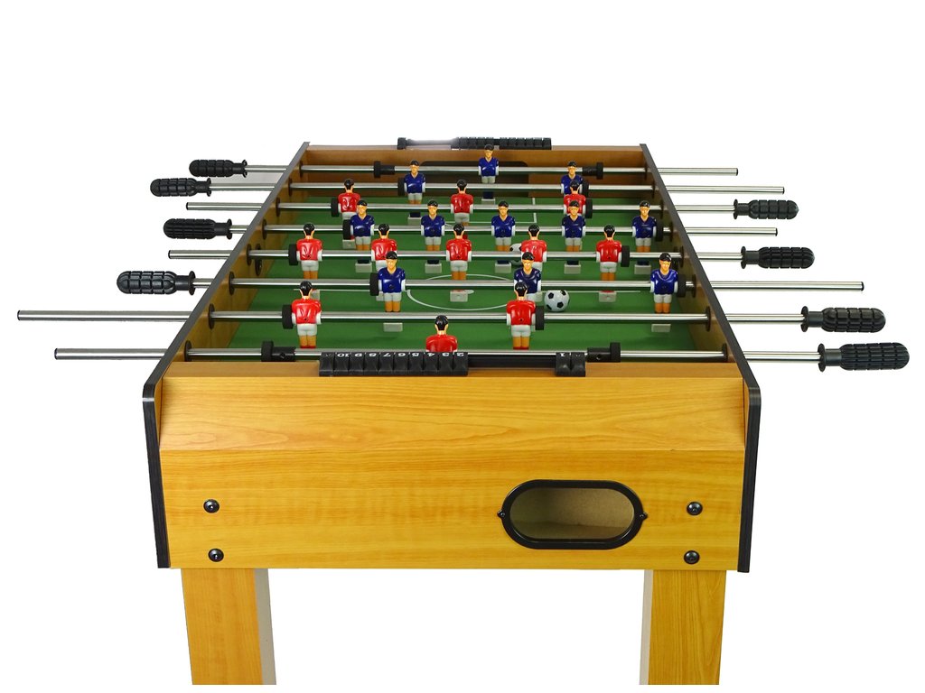 Zahrajte si fotbal se svými dětmi, aniž byste opustili teplý domov! Kdo dá víc gólů? A kdo se dostane do finále Světového poháru? Stolní fotbal je znám a oblíben již mnoho let, ale navzdory tomu neustále vzbuzuje skutečné, horké emoce. Každý fotbalový fanoušek to musí mít - nezáleží na věku, jen na touze bavit se! Pevný materiál, ze kterého je hračka vyrobena, je zárukou dlouhodobého používání. Díky svým vlastnostem se snadno čistí, díky čemuž je vysoká úroveň bezpečnosti a hygieny plynoucí ze hry. Velikost hřiště vám umožní hrát i v jakékoli místnosti v domě, může být trvalým prvkem výzdoby dětského pokoje. Fotbalová hra může začít, když se jí zúčastní alespoň 2 lidé - čím více hráčů, tím pravdivější a více vzrušující turnaj bude. Pravidla hry jsou jednoduchá - každý si vybere, do kterého týmu patří, modrý nebo červený, postaví se na správnou stranu a může začít hrát! Praktické knoflíky dobře padnou do ruky, takže se na páčkách hráči snadno orientují. Dřevěné stojany hřiště zajišťují hřiště, díky čemuž míč nespadne za hranice hřiště. Nad každým z gólů je počítadlo s posuvným prvkem, které usnadňuje rychlé skórování obou týmů.