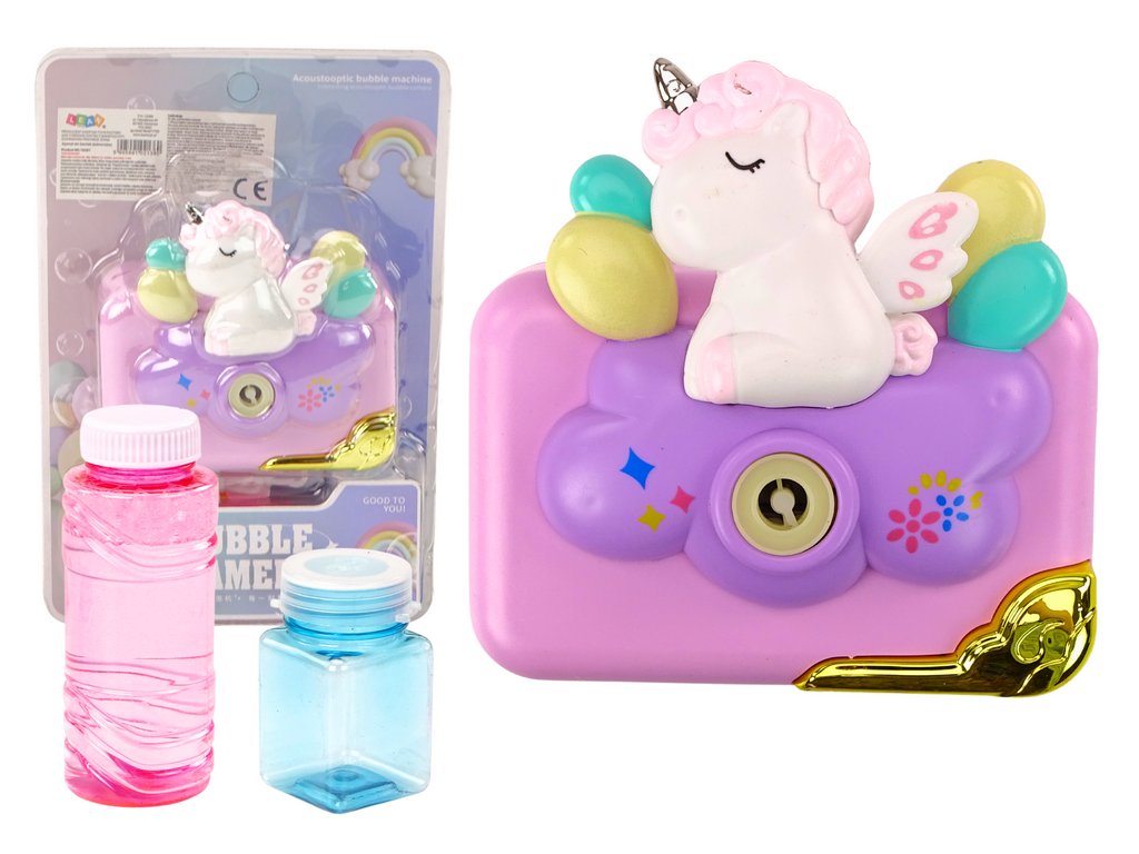 Stroj na bubliny ve tvaru fotoaparátu s jednorožcem