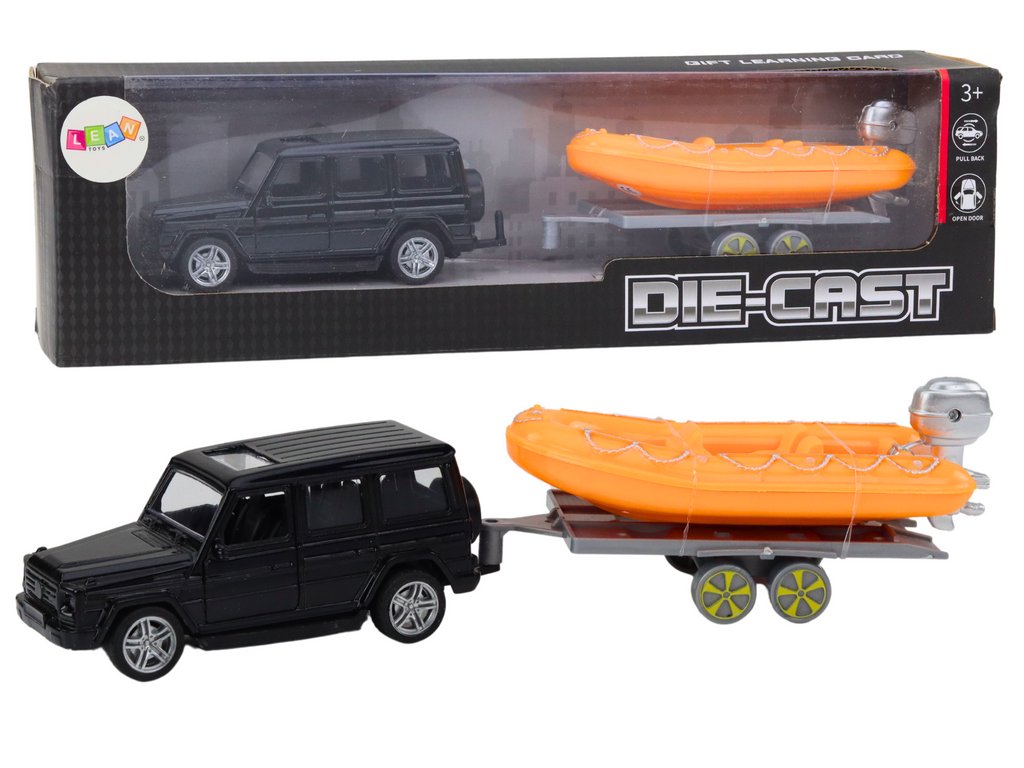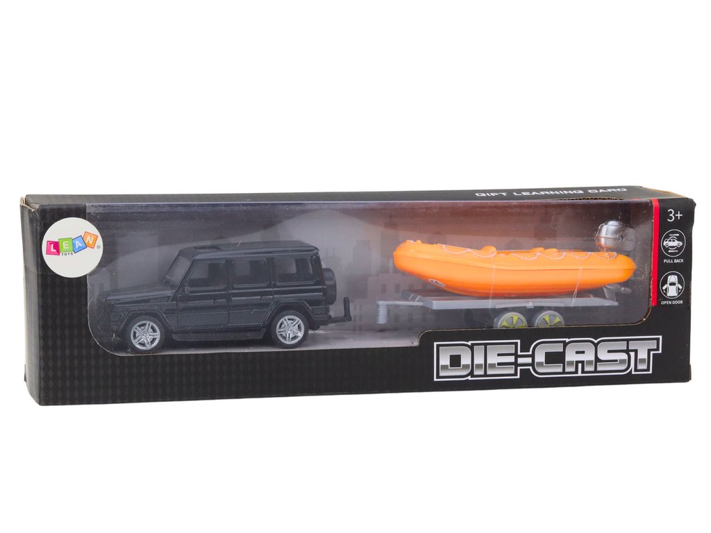 - 1x černé terénní auto, přívěs pro přepravu člunu a oranžový člun
