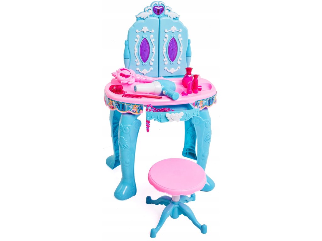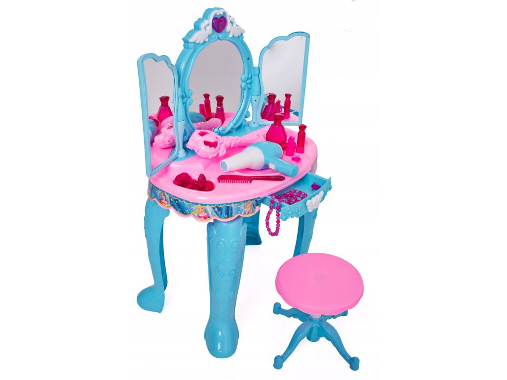 Fantastický toaletní stolek pro malou slečnu, díky kterému se bude cítit jako skutečná princezna. Toaletní stolek má otočné zrcadlo - stačí stisknout tlačítko a začnou hrát a blikat světla. Hračka má navíc police, díky nimž malá princezna skryje šperky nebo jiné poklady. Sada obsahuje funkční fén na vlasy. Stačí zapnout knoflík a začne foukat vzduch. Vzduch není horký, díky čemuž je sušička pro vaše dítě zcela bezpečná.