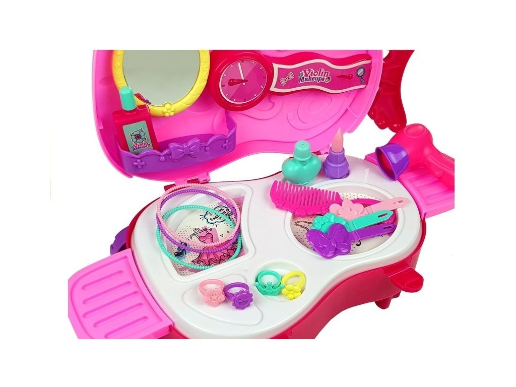 Kosmetická sada je skvělá hračka pro všechny dívky, které se rády oblékají před zrcadlem. Sada skládající se z kufru zdobeného zrcadlem a mnoha plastových doplňků umožní dítěti dlouhou zábavu. Možnost zahrát si na kosmetičku jistě potěší každou holčičku. Barevný toaletní stolek má kolečka a madlo, což dítěti výrazně usnadňuje přesun z kufříku ve tvaru houslí.