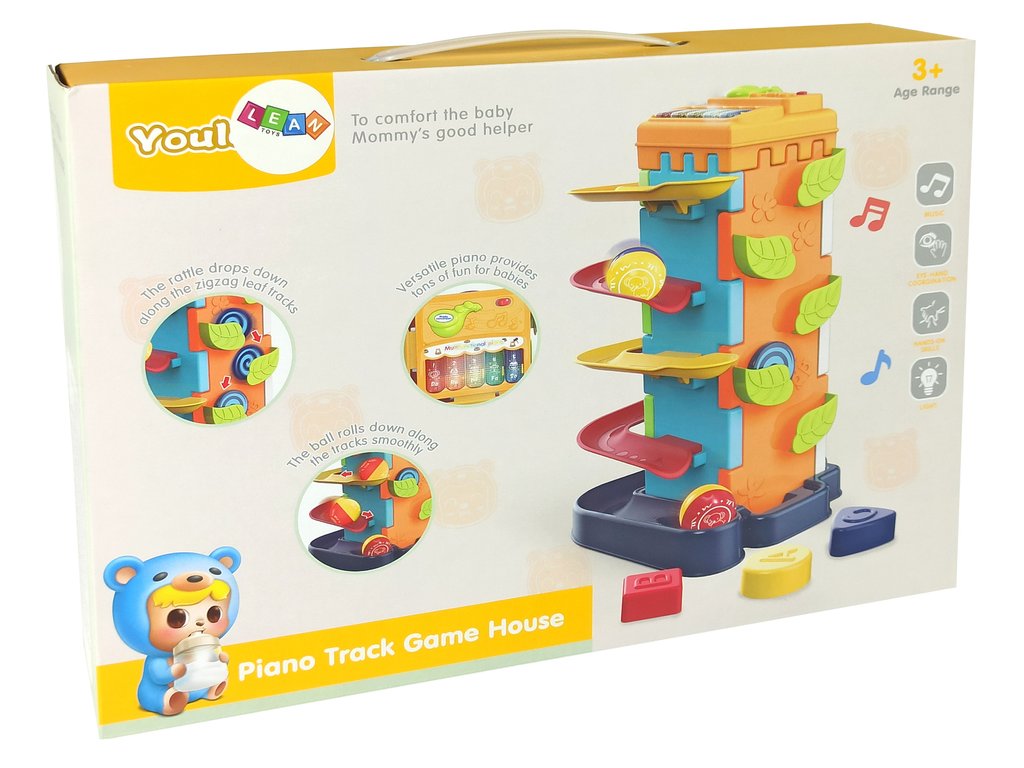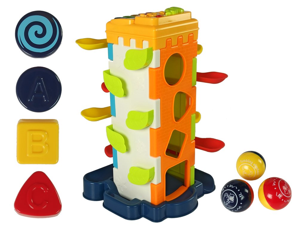Vložte míčky do otvoru v první plošině a nechte je volně klouzat po patrech a spadnout dolů. Na druhé stěně je třídička, do které může dítě umístit správné tvary bloků.