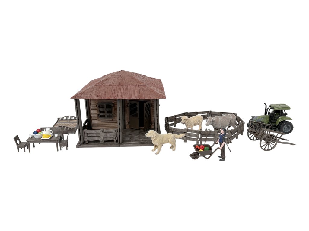 Součástí sady je farmářský domeček s otvíracími dveřmi, traktor se zemědělským náčiním, figurky farmářů, hospodářská zvířata (kráva, ovce, pes) a další doplňky – plot, kolečko, vůz, nábytek i ovoce a zelenina. Celá farma se dá sestavit podle návodu a poté libovolně upravovat.
