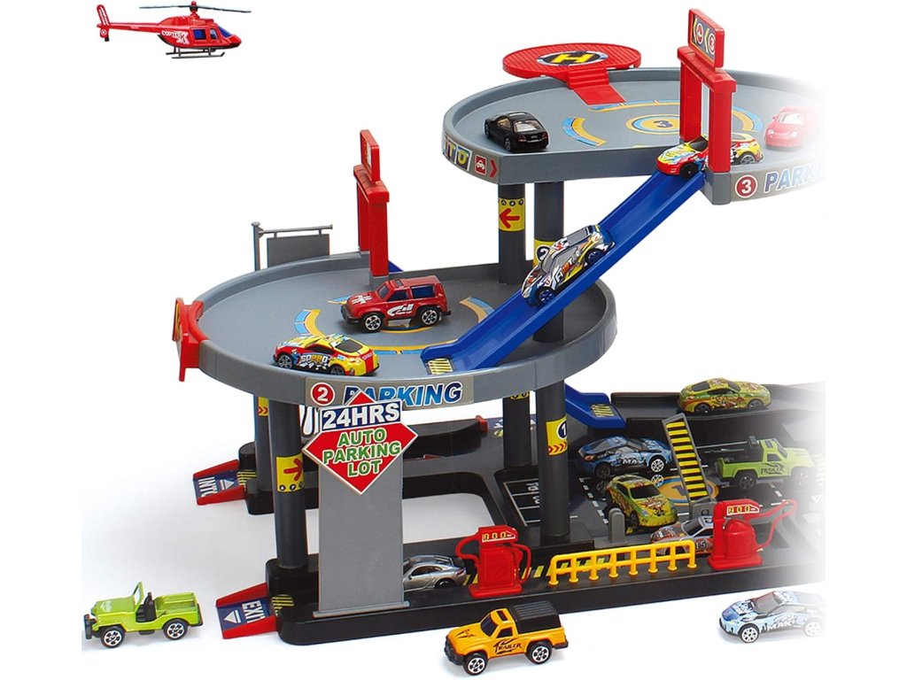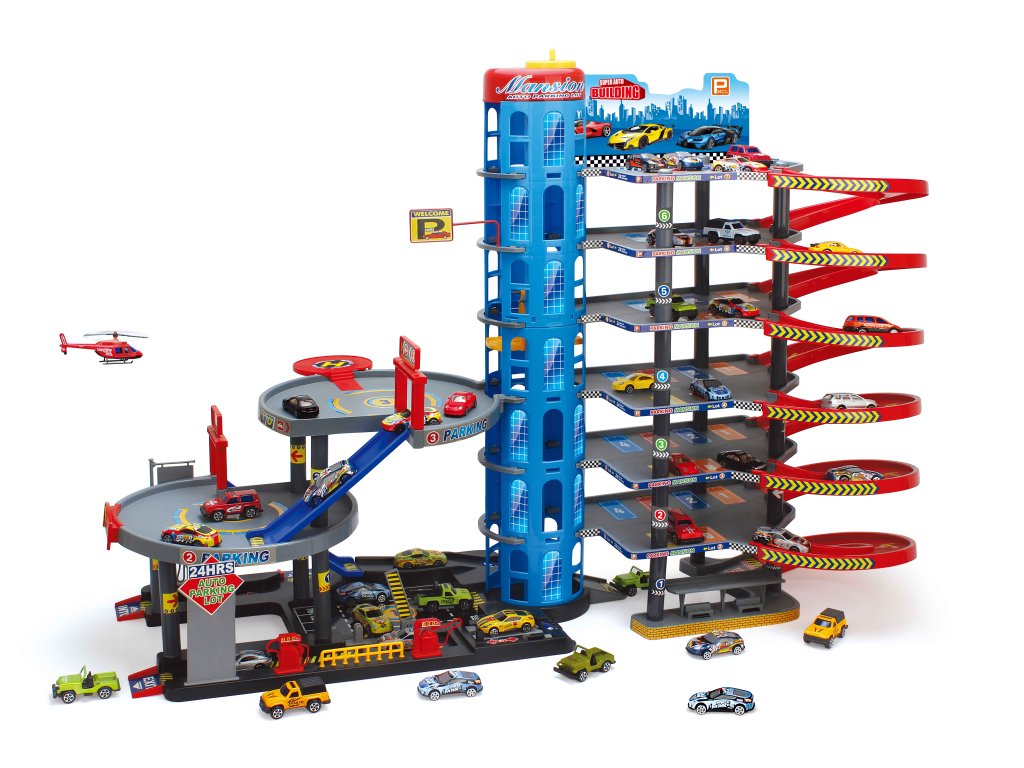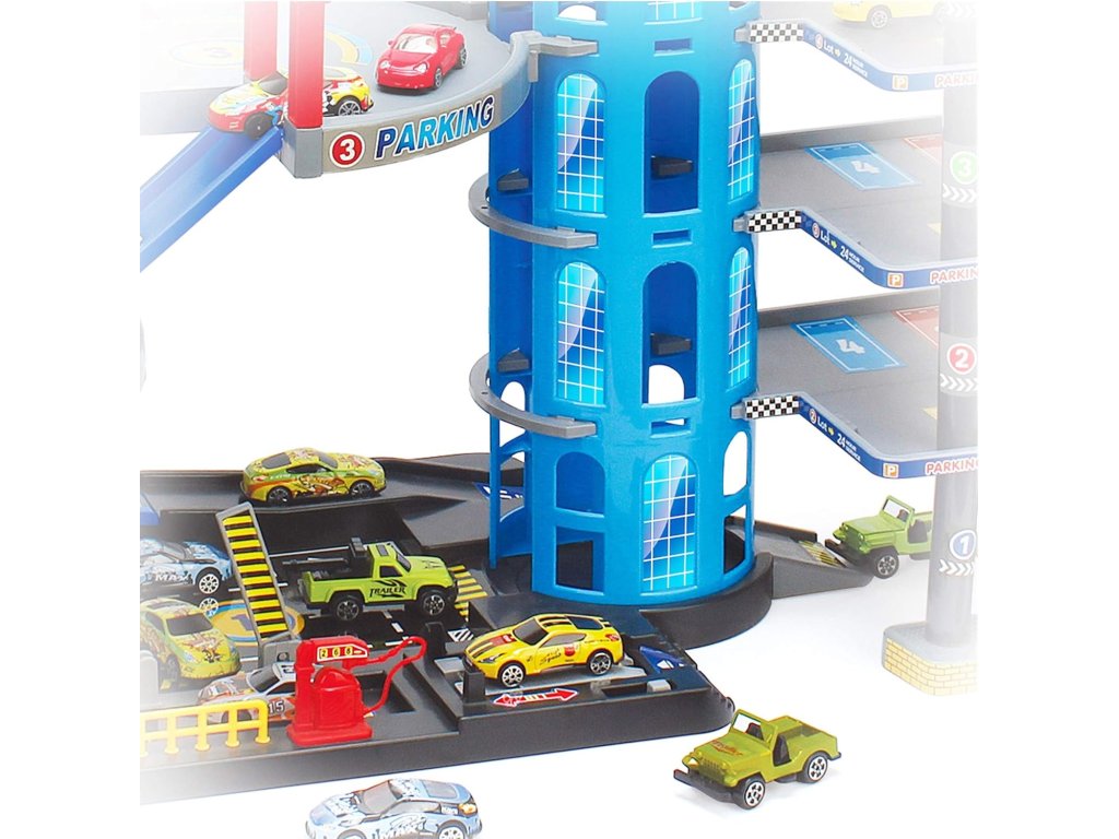 Velká a detailně propracovaná vícepatrová garáž s výtahem, spirálovými sjezdy a bohatou výbavou pro hraní s autíčky. Děti mohou auta vytahovat pomocí mechanického výtahu až do horních pater a poté je pouštět dolů po dlouhých spirálových drahách. Součástí jsou také autíčka, doplňky a interaktivní prvky, které zajišťují dlouhotrvající zábavu.