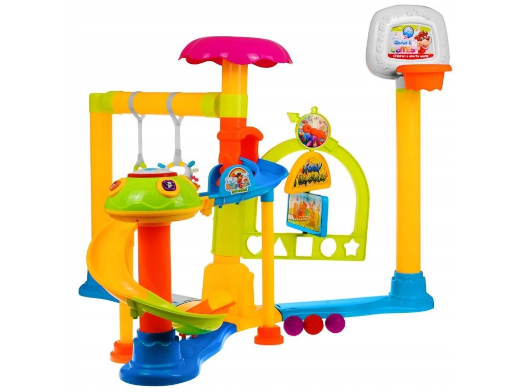 Multifunkční dětské hřiště, které se hodí jak do domu tak i na zahradu. Hračka je vyrobena z kvalitního, netoxického plastu. Celek je ve velmi hezkých živých barvách a nechybí zde ani zvukové efekty. Sada obsahuje míčky a basketbalový koš. Tento produkt si zamiluje každé dítě! Nuda zde jistě nehrozí. Hřiště napomáhá správnému rozvoji Vašeho dítěte, trénuje zde své manuální a koordinační schopností. Dítě se zde učí poznávat barvy a tvary.