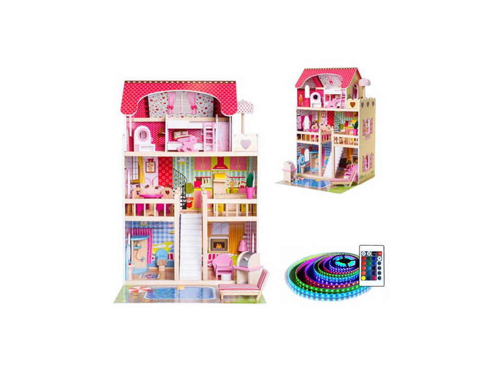 Velký dřevěný domeček s LED osvětlením pro panenky + vybavení