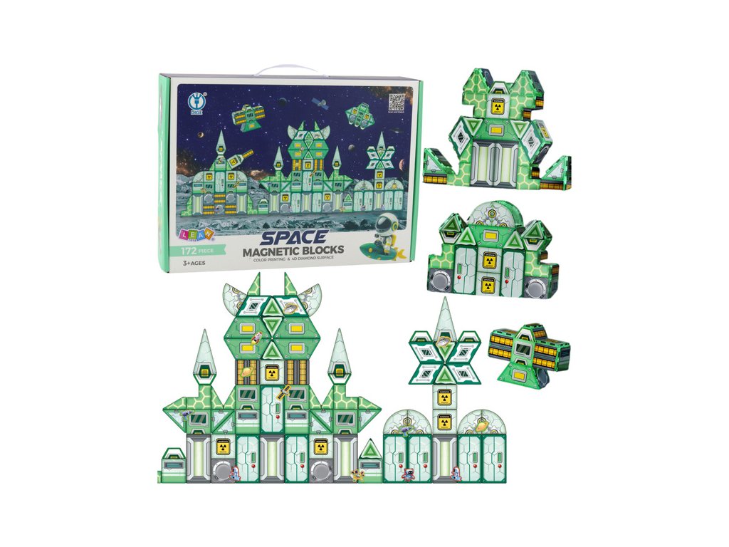 Magnetické stavebnice je jedinečnou vzdělávací sadou, která rozvíjí dětskou představivost a podporuje kreativní hru. Série byla inspirována tématem vesmíru, což je patrné z futuristického designu, barev a grafických prvků umístěných na povrchu kostek. Sada se skládá až ze 172 prvků různých tvarů - najdete zde trojúhelníky, čtverce, kosočtverce, 3D panely a ozdobné dlaždice s grafikou.