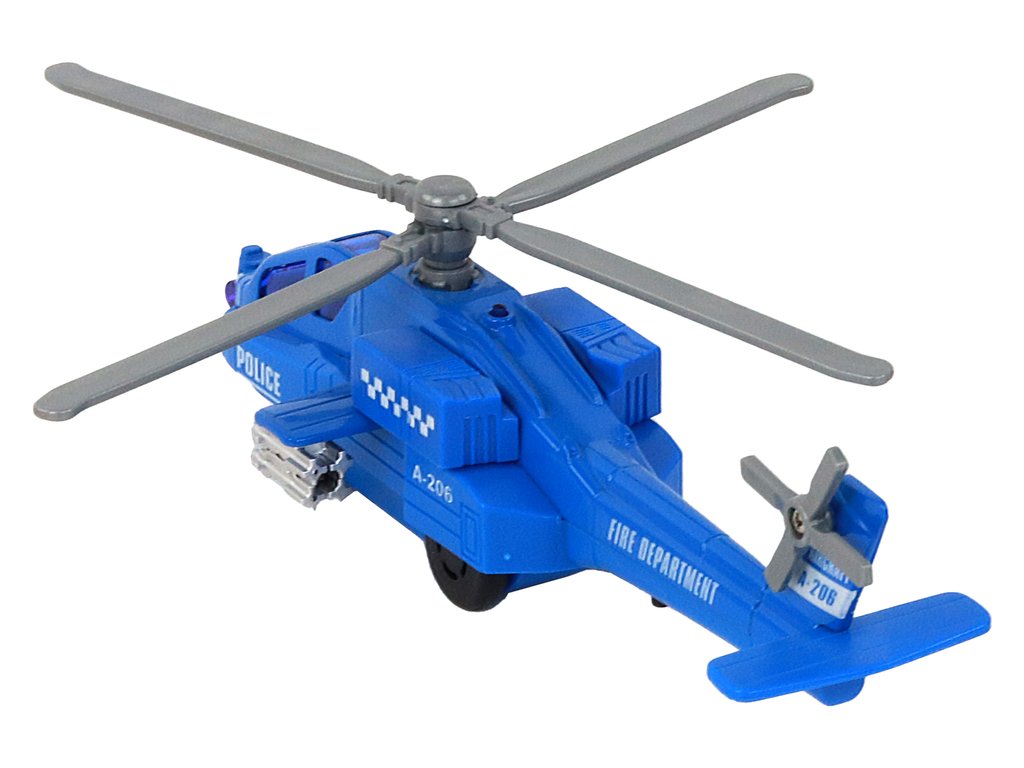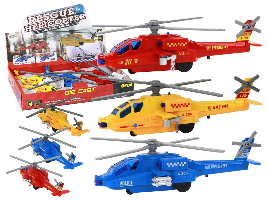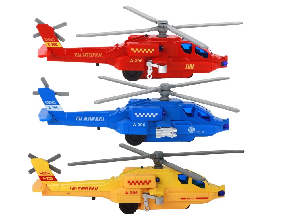 Každý vrtulník je vybaven pohonem, světelnými a zvukovými efekty. Po natažení se spustí pohonný mechanismus, čímž se hračka automaticky rozjede. Navíc se začne otáčet rotor, což dodává další realismus a zábavu.