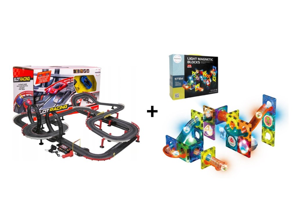 Výhodná sada Autodráha Gigant 1420cm + Magnetická svítící stavebnice kuličková dráha 49 dílů