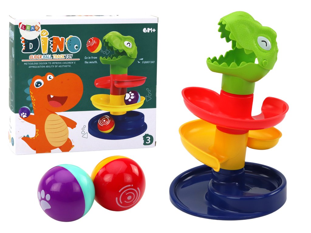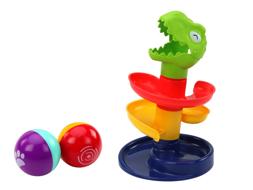Skluzavka se skládá ze 4 barevných úrovní, přičemž nejvyšším prvkem je zelená hlava dinosaura, což přidává prvek zábavy a fantazie. Během hry dítě trénuje koordinaci, přesnost a manuální dovednosti, vkládá míček do tlamy dinosaura a sleduje jeho volný pohyb po jednotlivých patrech až k poklesu na nižší úrovně.
