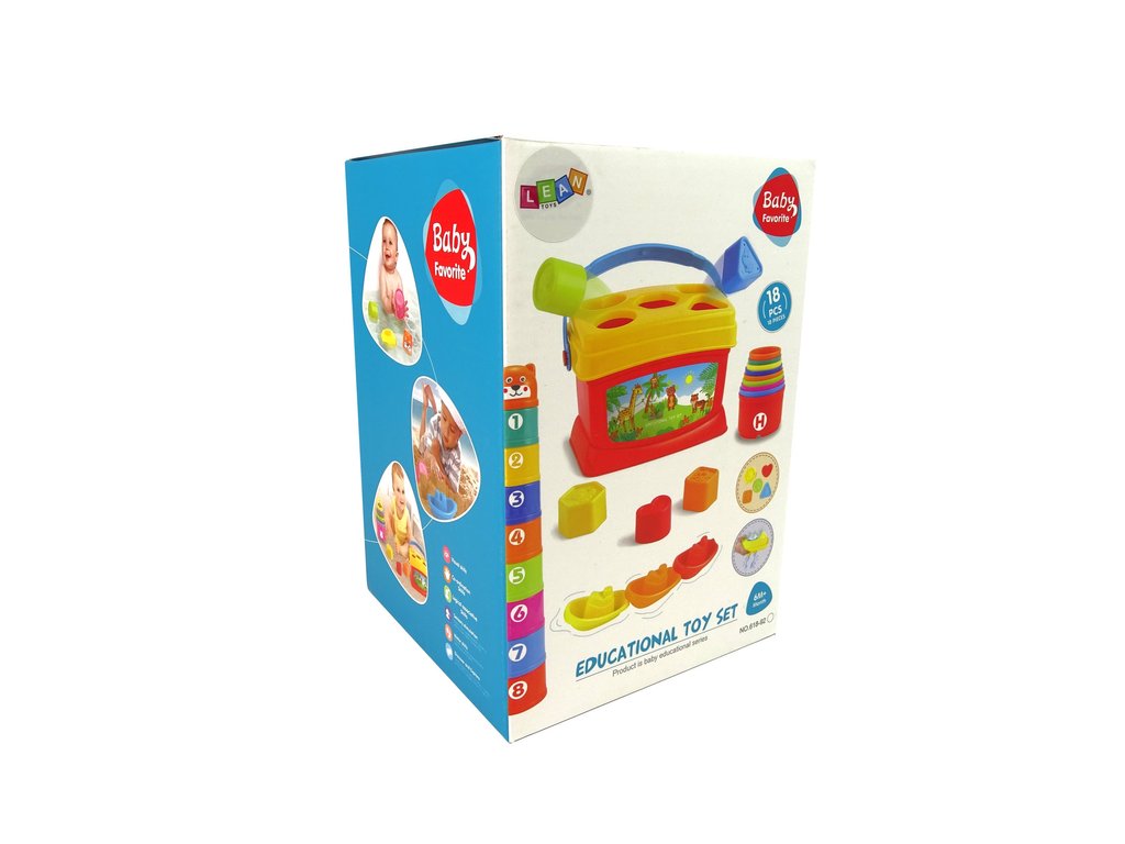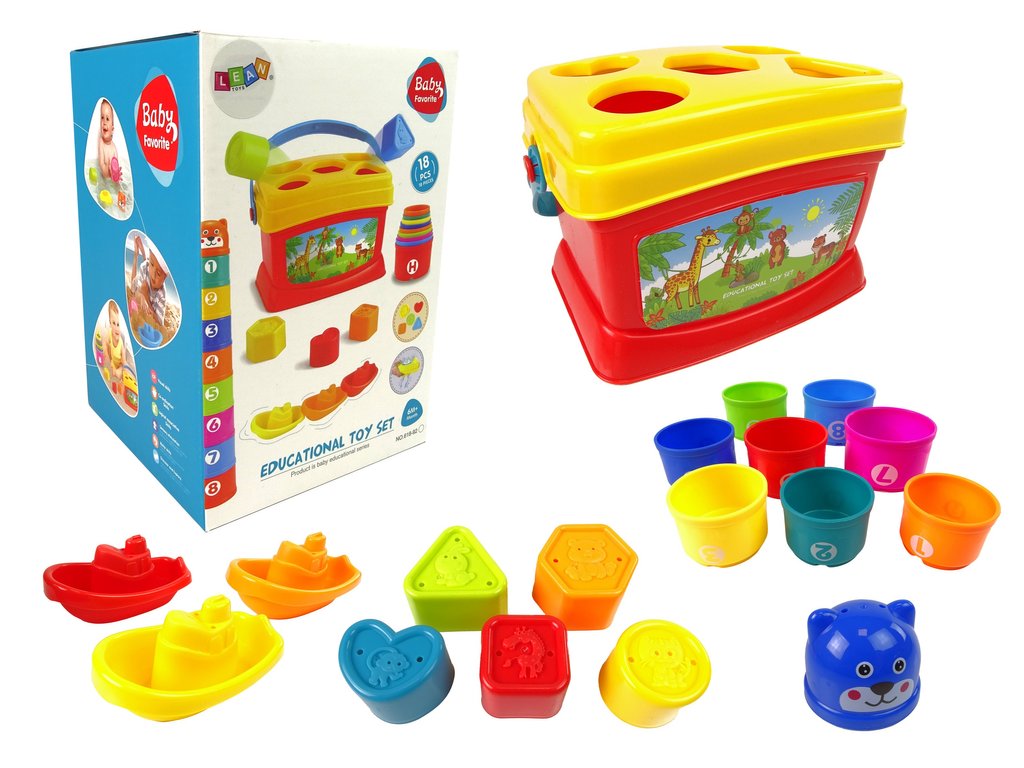 - S hračkou si lze hrát různými způsoby. Základna, kterou je kyblík, má na víku třídič s různě tvarovanými otvory pro umístění kostek se zvířátky. Batole se tak naučí nejen tvary, ale také zvířátka. Druhou možností je postavit vysokou věž, na jejímž vrcholu je hlava veselého medvěda! Pořádně naskládejte kelímky na sebe a vytvořte vysoký hrad.