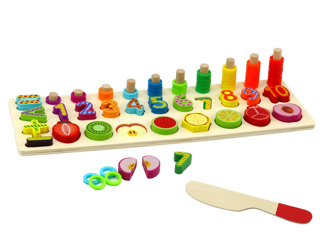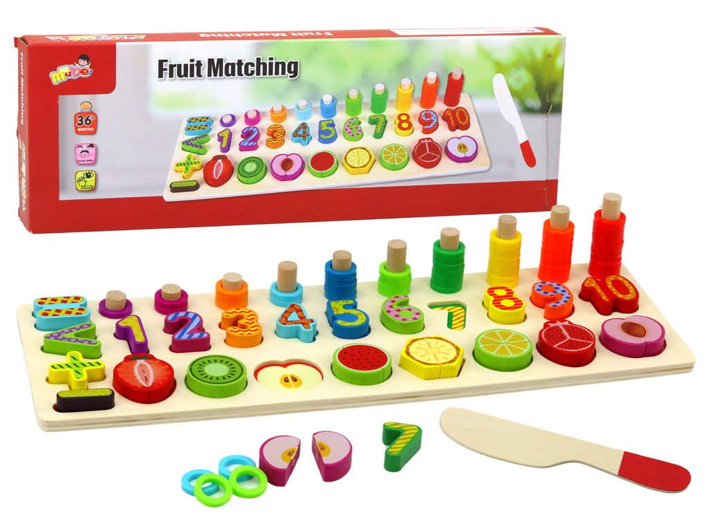 Deska je vybavena prohlubněmi s čísly a barevným ovocem, což představuje ideální platformu pro učení počítání, rozpoznávání tvarů a barev a rozvíjení vizuálně-motorické koordinace. Děti mohou vkládat ovoce a čísla do odpovídajících prohlubní, což pomáhá v rozvíjení schopností třídění a klasifikace.