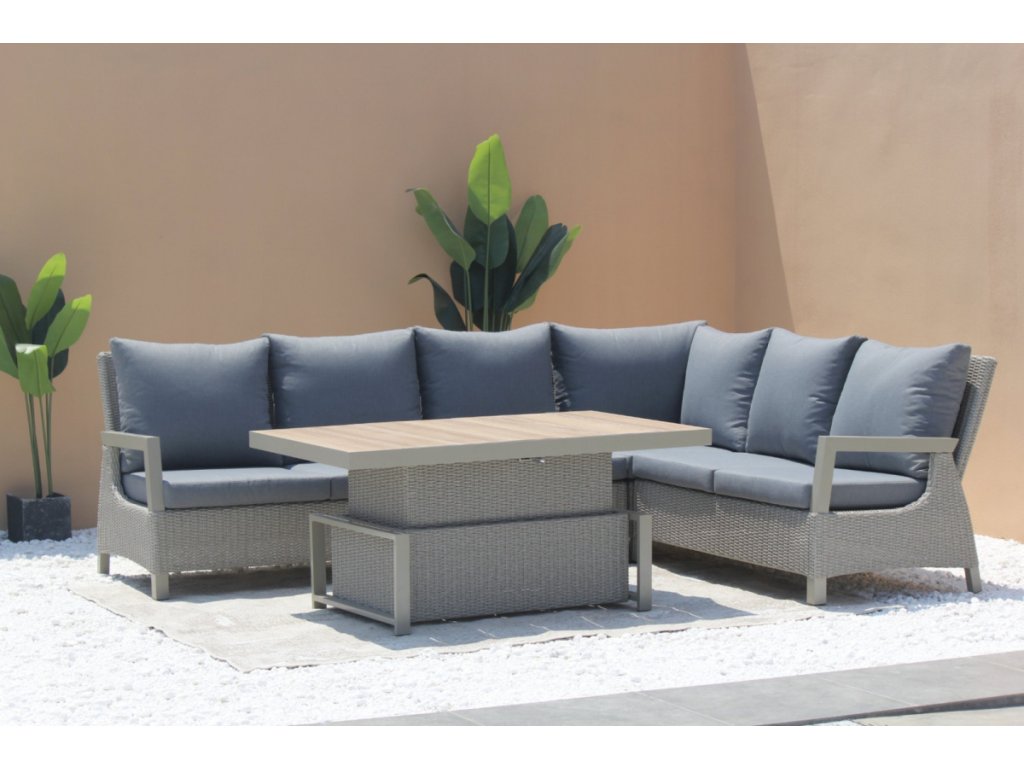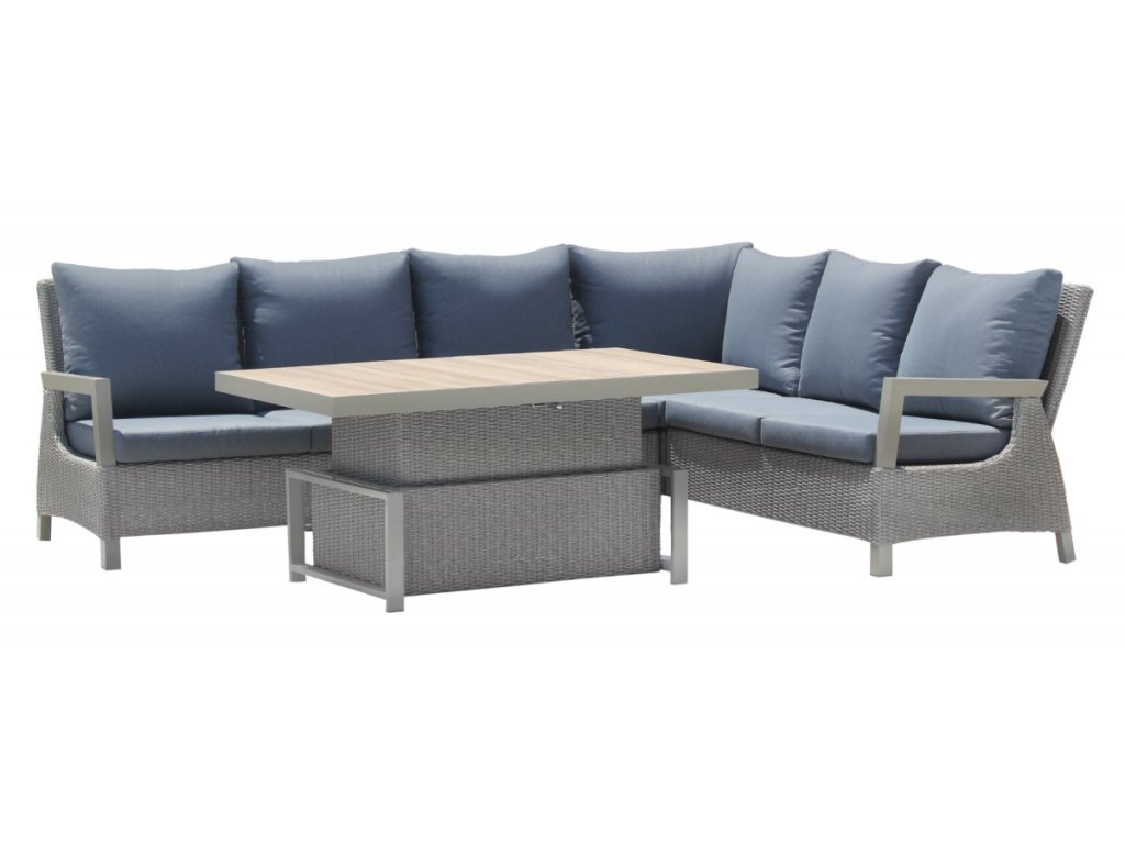 Sada obsahuje pohodlnou rohovou sedačku, výškově nastavitelný stůl s keramickou deskou a třináct měkkých polštářků. Konstrukce všech prvků sestavy je osazena na hliníkových rámech.