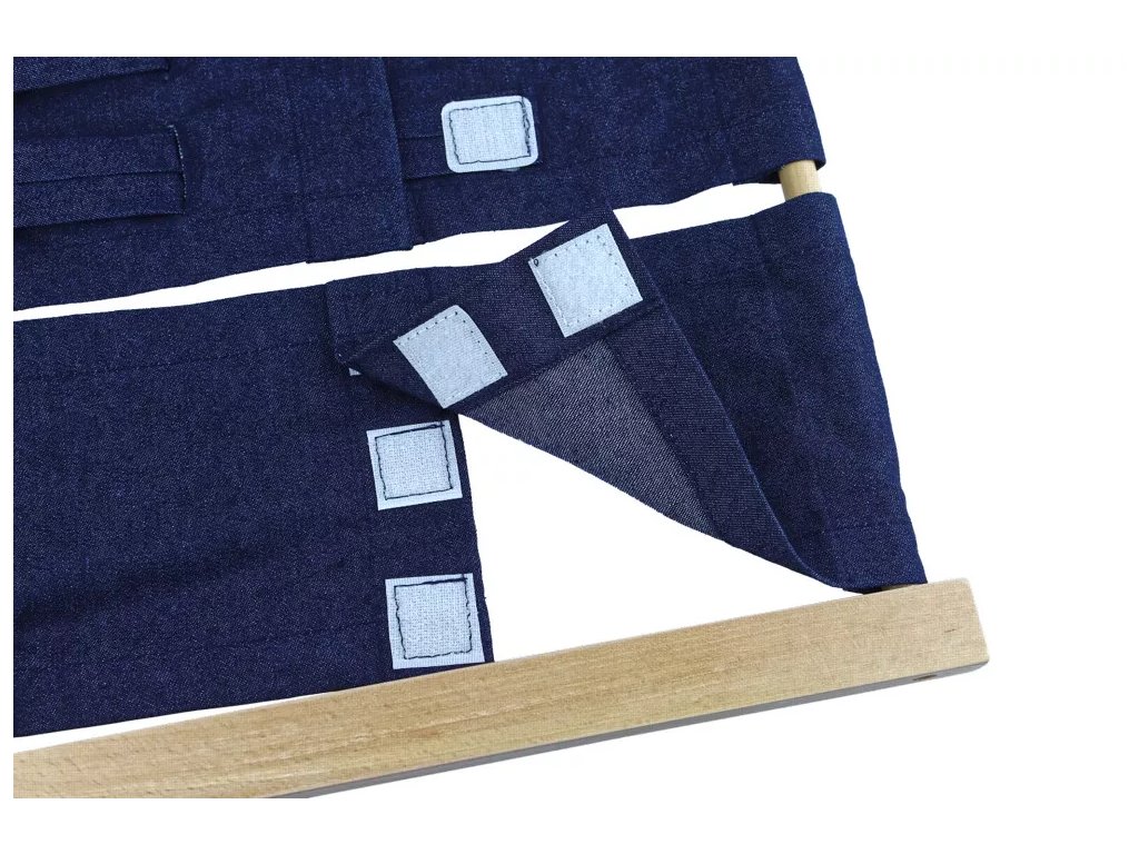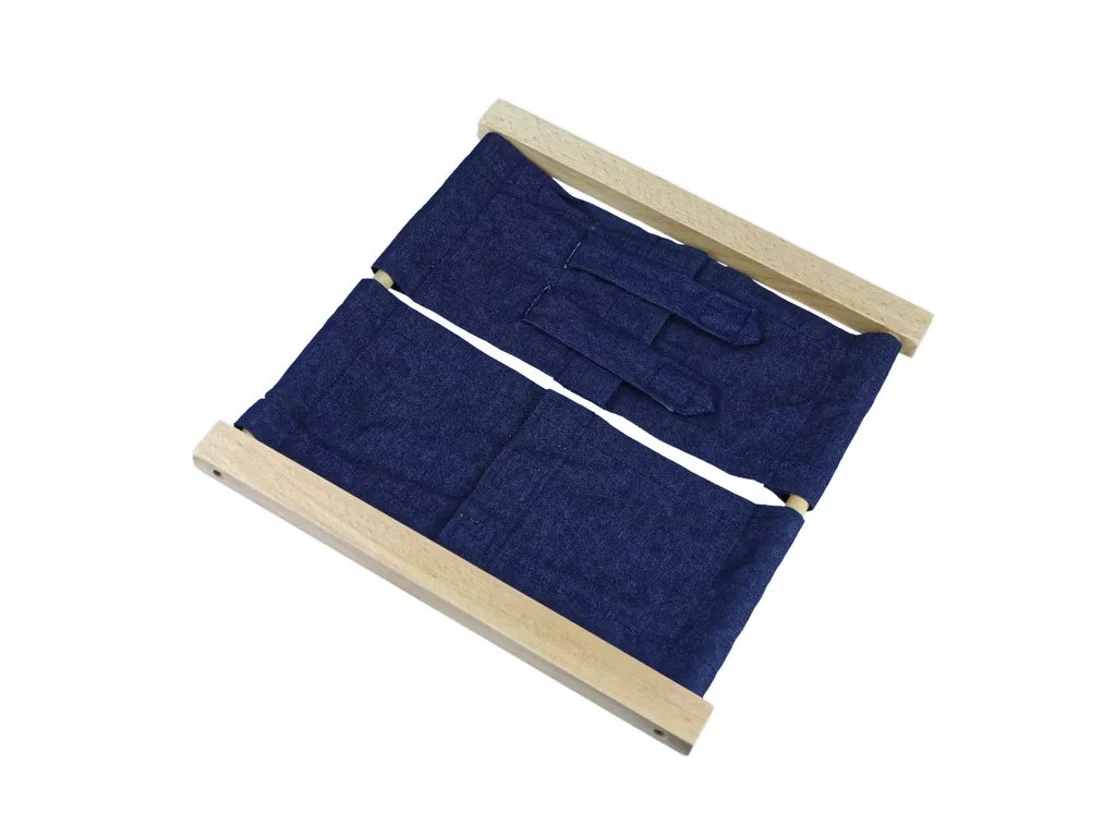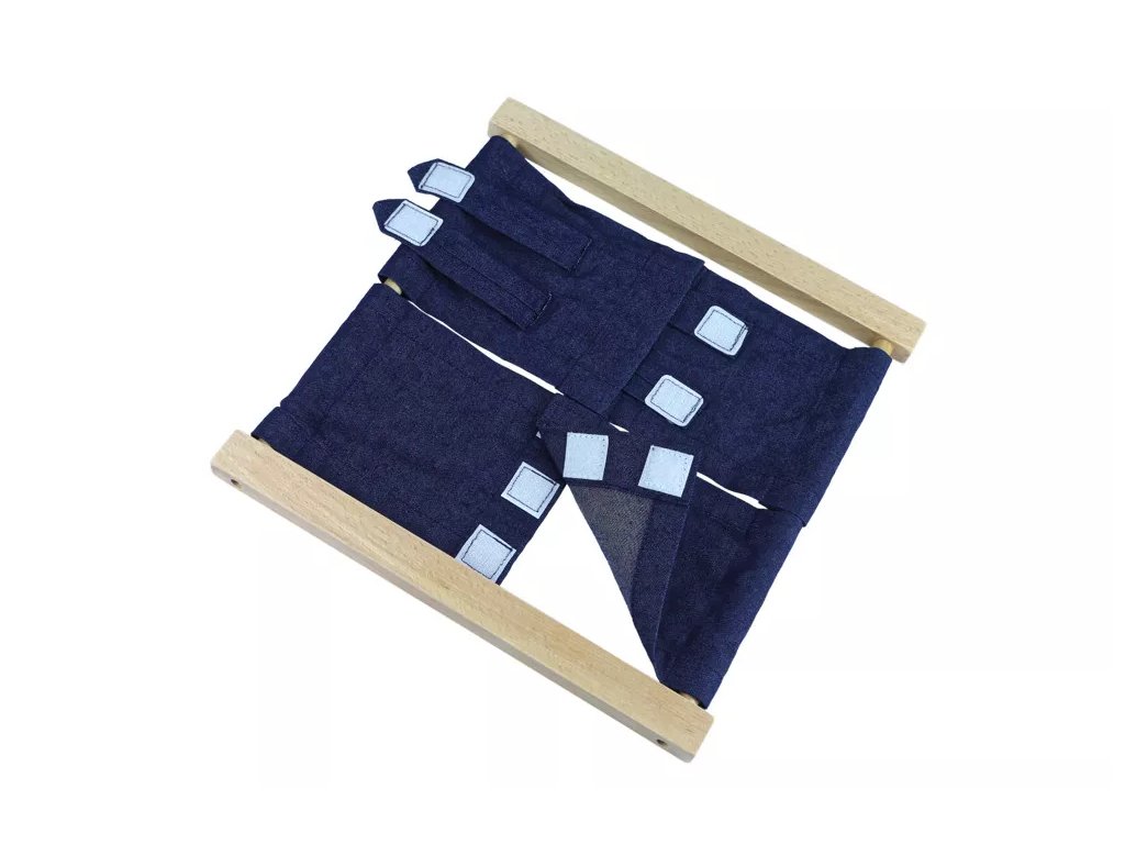 Zapínací rám se suchým zipem je součástí Montessori pomůcek v oblasti Praktického života – péče o sebe sama. Aktivita podporuje rozvoj jemné motoriky a samostatnosti dítěte při oblékání.