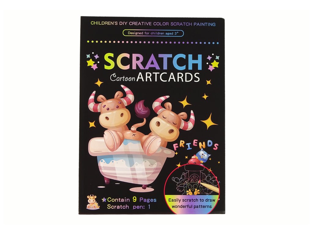 V sadě najdete 9 obrázků k seškrabání. Zábava je jednoduchá: pomocí speciální dřevěné špejle můžete z obrázku seškrabat černou vrstvu a odhalit krásné a barevné ilustrace.