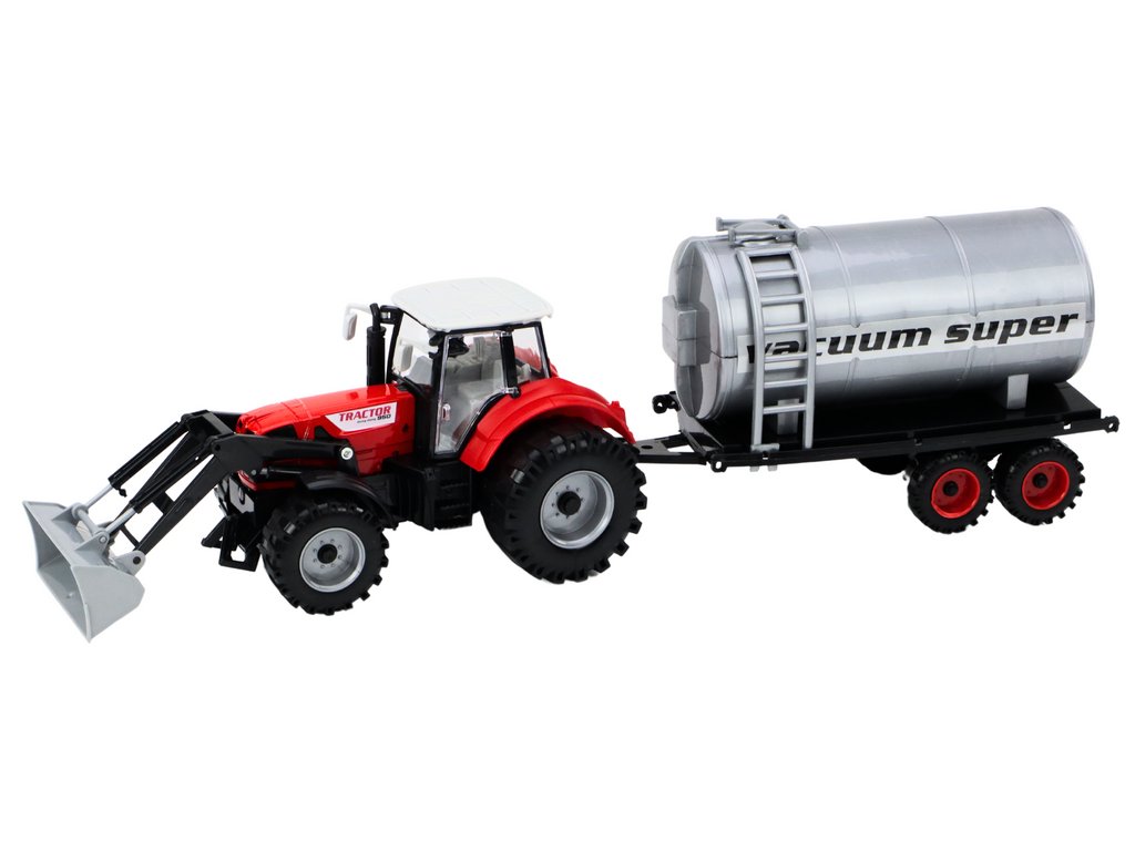 Zemědělský traktor s bagrem a cisternou červený s pohonem