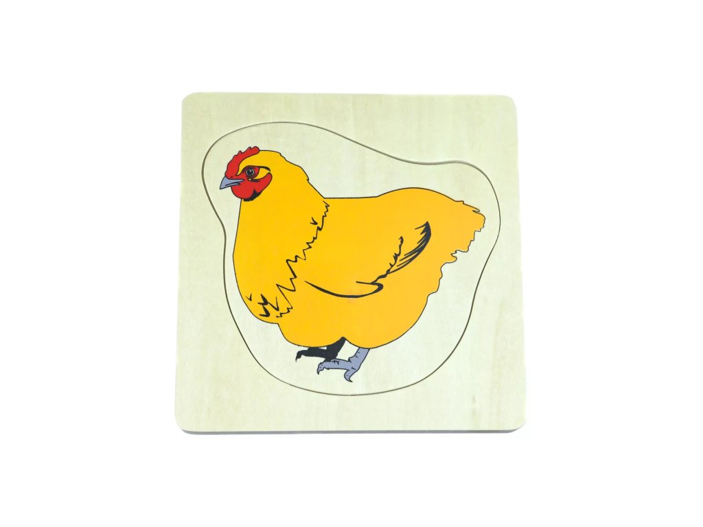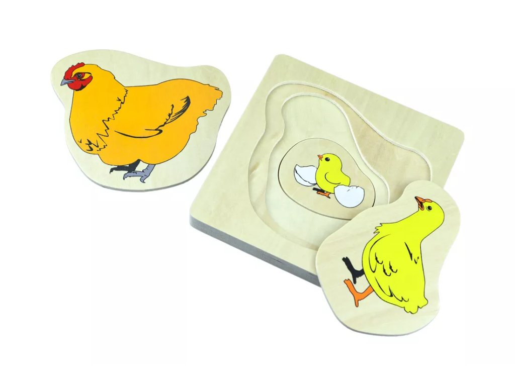 Puzzle je tvořeno čtyřmi vrstvami, které zobrazují postupný vývoj z vajíčka přes malé kuřátko a dospělé kuře až po slepici. Každá vrstva je vyřezaná z dřeva a usnadňuje dítěti pochopení posloupnosti biologického vývoje.