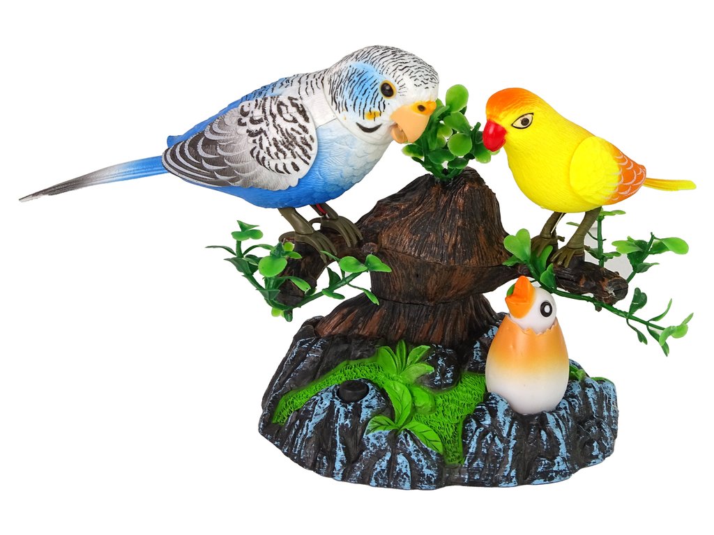 Tato okouzlující a interaktivní hračka přenáší děti do světa přírody. V sadě najdeme dva papoušky (modrého a žlutého), kteří sedí na větvi stromu a malého papouška ležícího pod ním. Ptáčci na větvích vydávají různé zvuky a hýbají se, malý papoušek svítí barevným světlem. K aktivaci hračky stačí stisknout černé tlačítko.